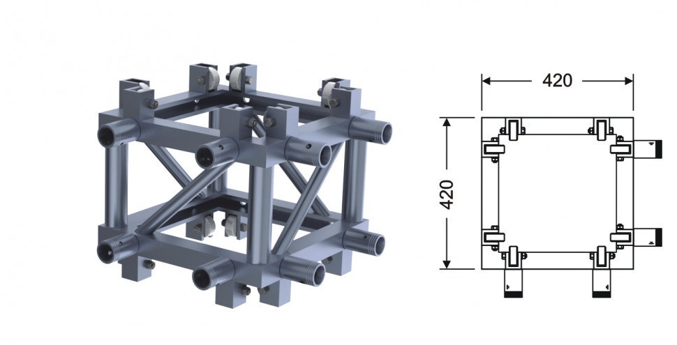 Прочная, алюминевая каретка, с угловым соединением 2-х квадратных ферм, для подъемных конструкций.