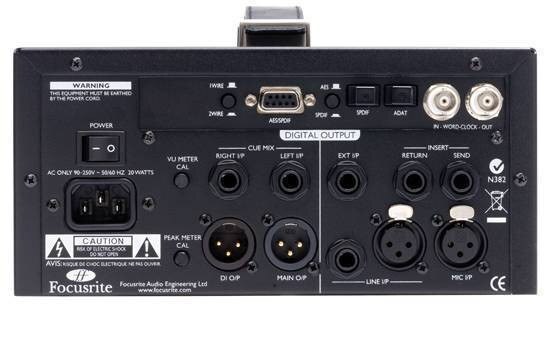 Устройство FOCUSRITE ISA One Analogue обладает большим количеством входов и выходов, большая часть которых расположена на задней панели его корпуса. В их число входят TRS (линейный) и XLR (микрофонный) выходы, а также два входа с левого и правого каналов (Cue Mix) и один моно-вход EXT I / P. В непосредственной близости от входов расположен выключатель питания.