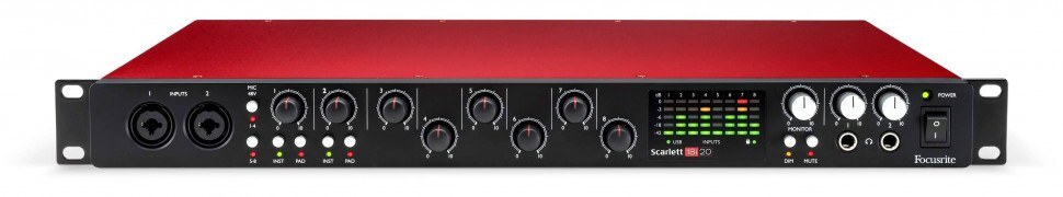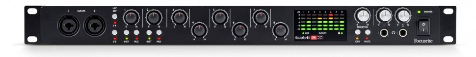 Focusrite Scarlett 18i20 является центром вашей студии. В общей сложности 18 входов и 20 выходов позволяют записывать весь спектр инструментов музыкального коллектива, от набора ударных до духовой секции помимо гитар, клавишных инструментов и вокала. Восемь комбинированных входных каналов с микрофонными предусилителями Scarlett, обладающими уровнем цифровой задержки в 2.74 мс дополнены множеством различных каналов. Вход ADAT позволяет расширить кол-во каналов записи для больших сессий. Focusrite Scarlett 18i20 поставляется с эксклюзивной версией Pro Tools | First и Ableton Live Lite и совместимы со всеми версиями MAC и PC.