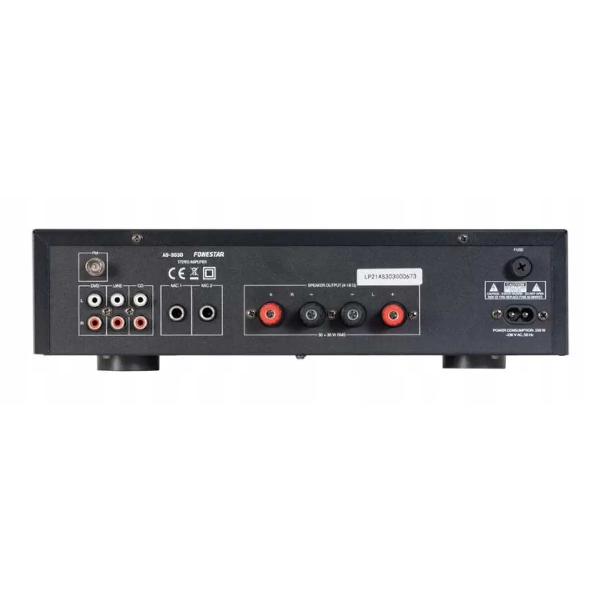 FONESTAR AS-3030 — это усилитель мощности, предназначенный для создания качественной звуковой системы в одном помещении. Он обеспечивает высокое качество звука и совместим со всеми современными акустическими системами, включая FONESTAR и другие бренды, при условии, что входной импеданс колонок составляет от 4 до 16 Ом (низкоомные системы).