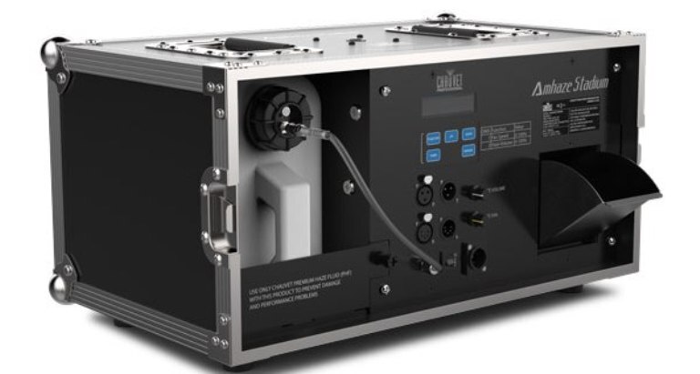Chauvet AmHaze Stadium — профессиональный генератор тумана на водной основе предназначен для применения на больших площадках, таких как крупные концерты и масштабные мероприятия. Генератор помещен в прочный металлический корпус, благодаря чему его удобно брать с собой на гастроли или в туры. Также будет удобным транспортировать устройство, благодаря утопленным ручкам. Производительность устройства составляет 14,000 куб. футов, но не смотря на это он нагревается до рабочей температуры за считанные секунды, на это уйдет всего около 30 секунд. Потребление жидкости составляет 22 мл в минуту. Управление может осуществляться удаленно через DMX (2 канала), также вручную может регулироваться выход тумана и скорость распространения при помощи регуляторов. Кроме того, для этого генератор оснащен удобным жидкокристаллическим экраном. Из разъемов на обратной стороне расположились 3-пиновый XLR и 5-пиновый XLR. Эффективное потребление жидкости длится до 11 часов на одном контейнере для жидкости.