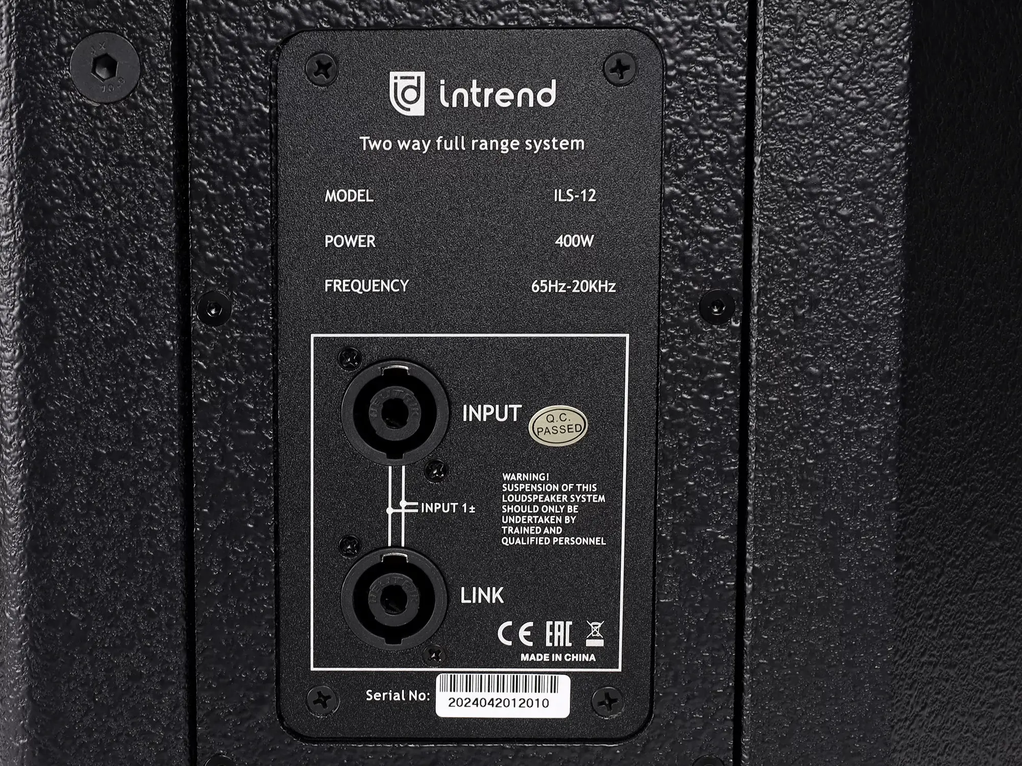 Акустическая система Intrend [ILS-12] пассивная, двухполосная, корпусная. 12"НЧ, 1,75"ВЧ, 85°x50°, 48-20000 Гц, SPL 124 дБ, 400 Вт RMS, 8 Ом. Цвет чёрный, корпус дерево.