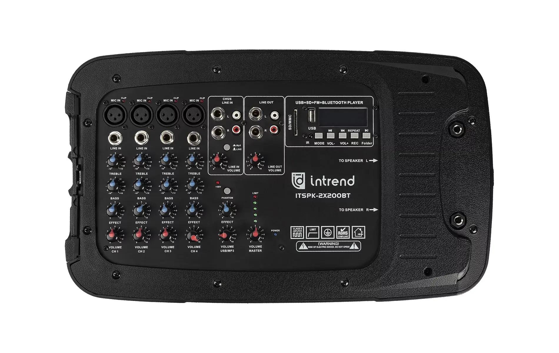 Комплект акустических систем Intrend ITSPK-2X200BT Документация и программное обеспечение по звуковому оборудованию Intrend Характеристики продукта Звуковая стереосистема, состоящая из двухполосных акустических систем с 10-дюймовым НЧ динамиком и 0,75-дюймовый ВЧ драйвером для качественного воспроизведение звука. Портативный дизайн. Акустические системы крепятся к блоку микшера-усилителя, образуя компактную систему, удобную для переноски и мобильного использования. 6-канальный микшер имеет 4 моно и 1 стерео канал. Для всех каналов доступна эквализация по верхним, средним и низким частотам. 4 высококачественных микрофонных входа с переключаемым фантомным питанием +48 В для конденсаторных микрофонов. Процессор эффектов студийного уровня 24-бит с эффективным подавителем обратной связи. Встроенный усилитель класса D. Встроенный MP3 плеер.