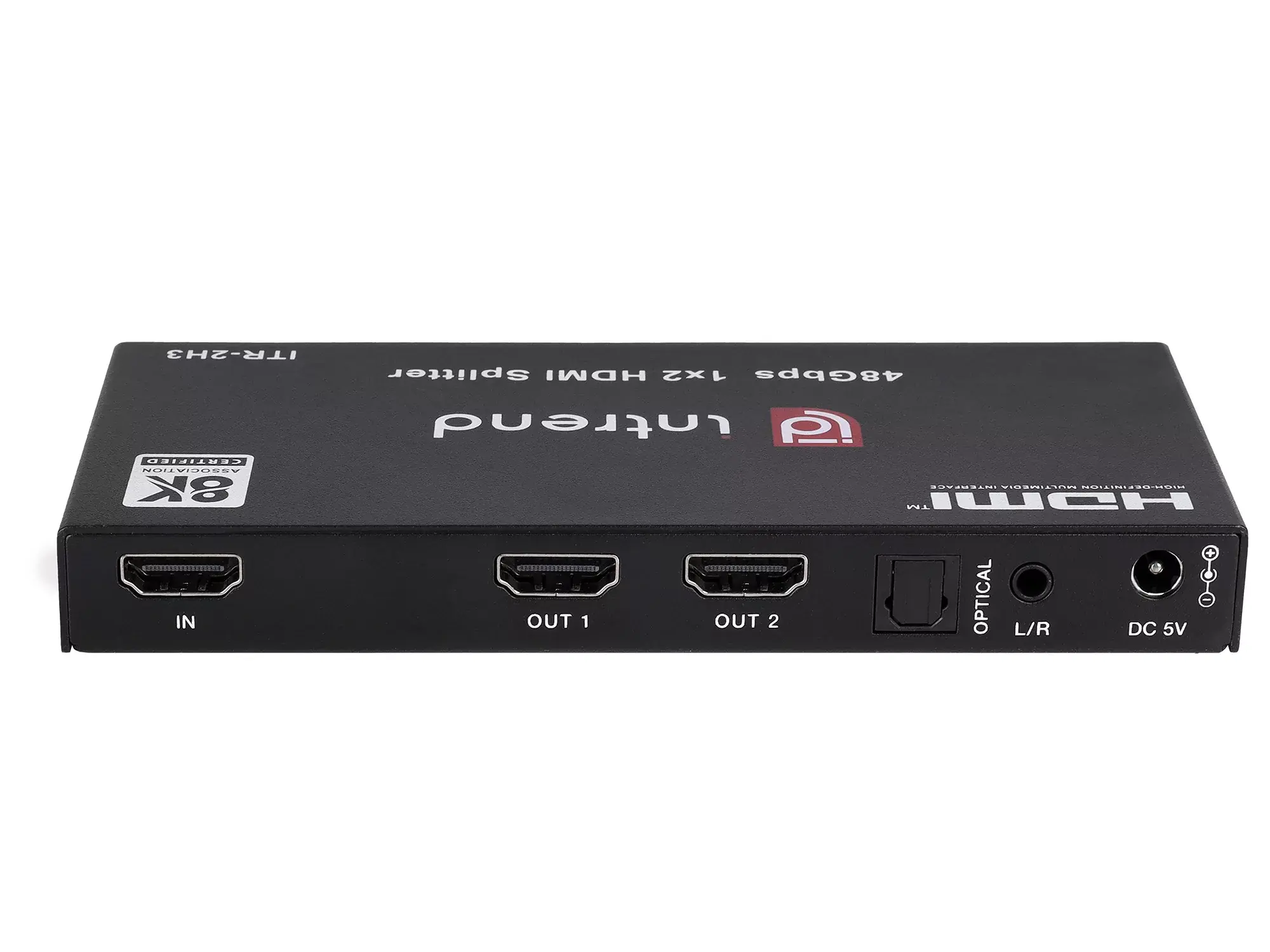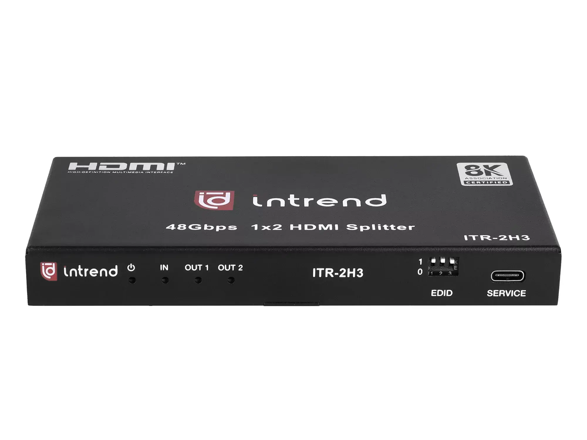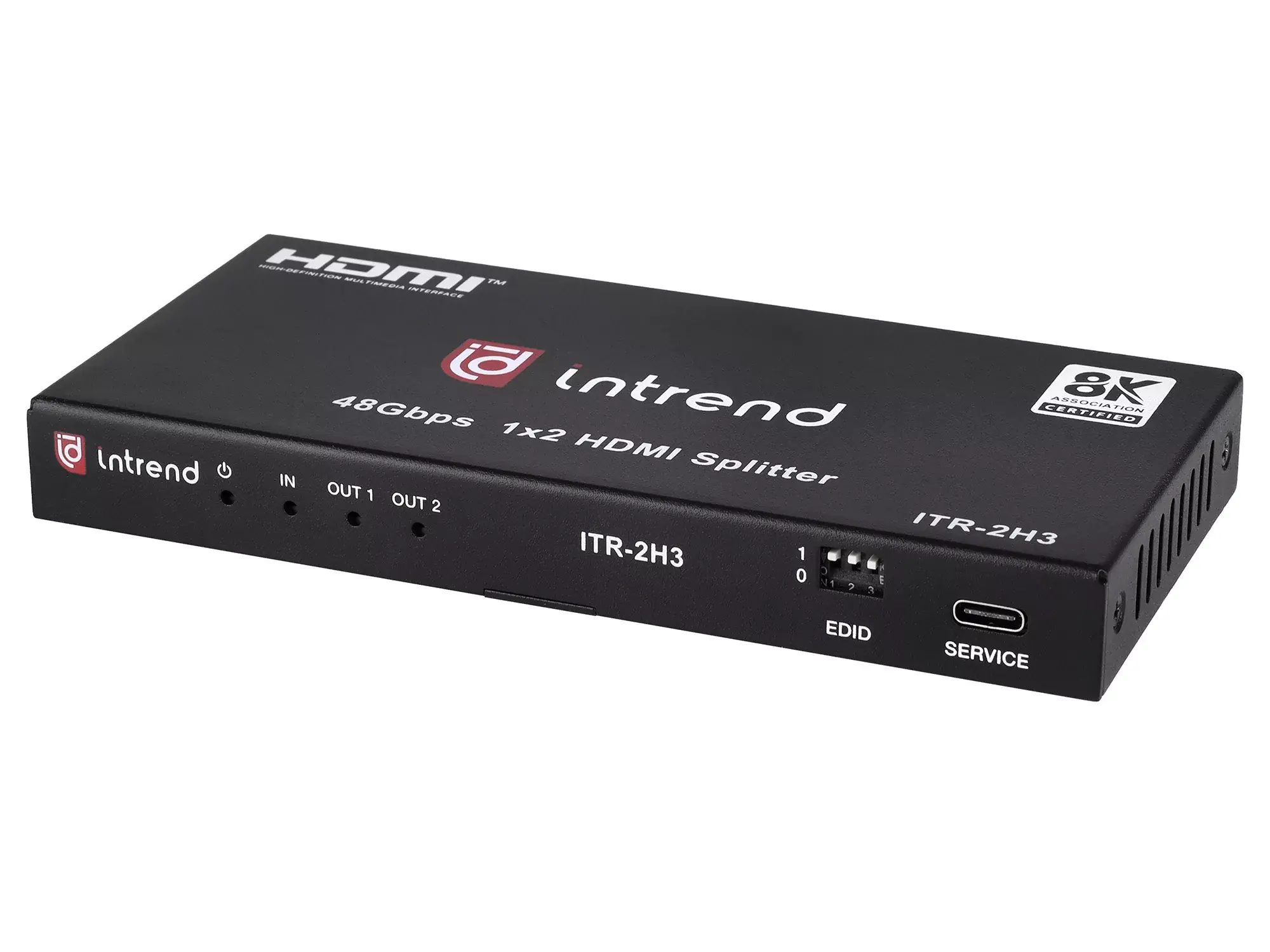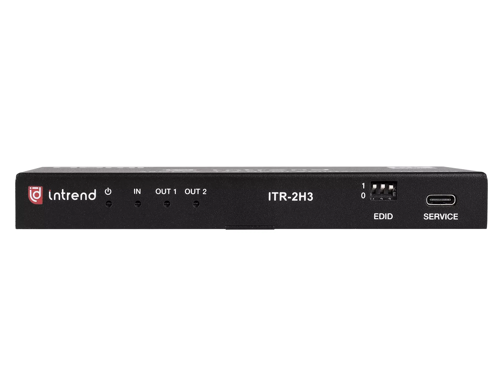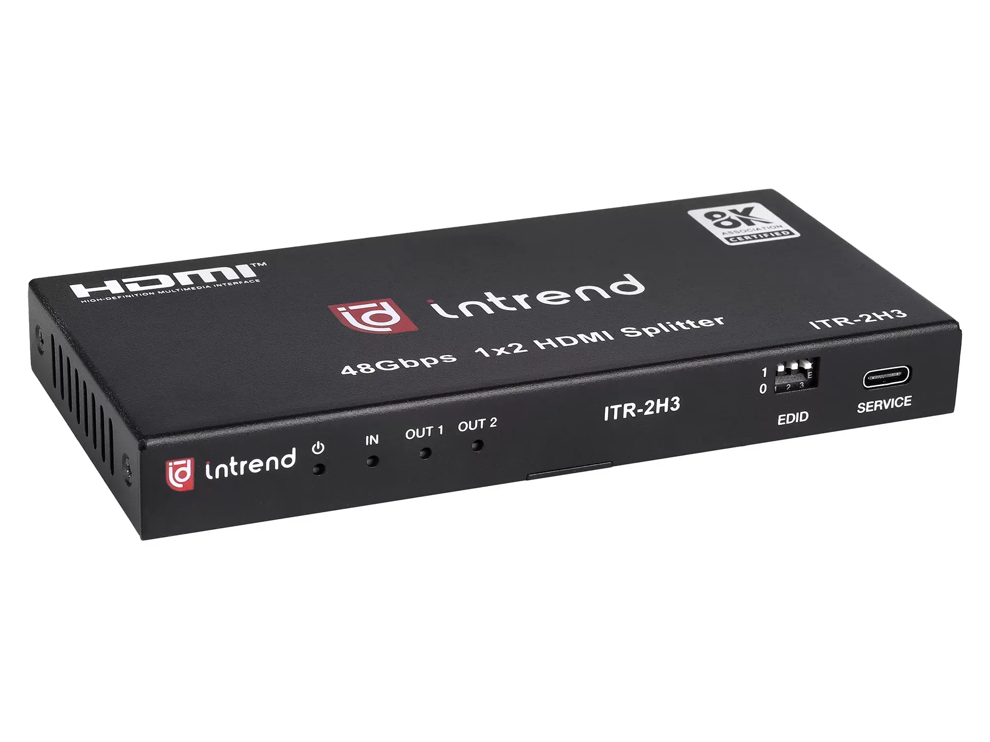 Усилитель-распределитель HDMI 1:2 Intrend ITR-2H3 Усилители-распределители типа InTrend ITR-2H3, ITR-4H3, ITR-8H3 получают на входе сигнал HDMI разрешением до 8K и после усиления и обработки выводят его на 2, 4 или 8 выходов HDMI (соответственно). Видеосигнал 8K (с кадровой частотой до 60 Гц при глубине цвета 12 бит) может использоваться в новейших дисплеях. Для массовых дисплеев с меньшим разрешением выходы прибора могут автоматически уменьшать выходное разрешение и менять цветовой режим в соответствии с возможностями данного дисплея. В приборе предусмотрена гибкая настройка режимов EDID. Приборы поддерживают новейшие режимы передачи видеосигнала (варианты 3D, HDR, переменную кадровую частоту, HDCP) и эмбедированного звука, могут выполнять деэмбедирование звука из входного сигнала на оптический выход Toslink или аналоговый небалансный стереовыход.
