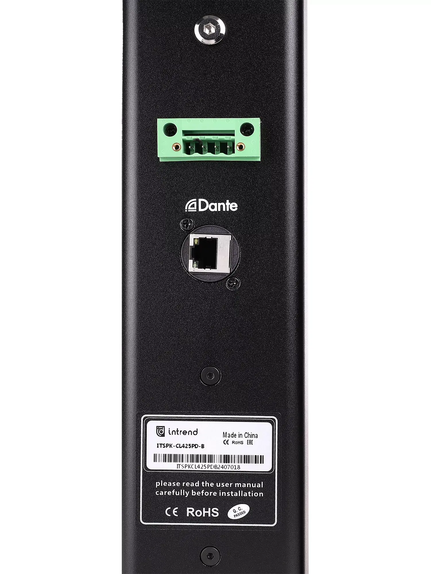 Звуковая колонна Intrend ITSPK-CL425PD-B Документация и программное обеспечение по звуковому оборудованию Intrend Обзор Звуковая колонна с поддержкой Dante Питание POE+ Стильное дизайнерское решение для переговорных и конференц-залов с превосходным качеством звучания в тонком корпусе 4x2.5" широкодиапазонных неодимовых драйвера