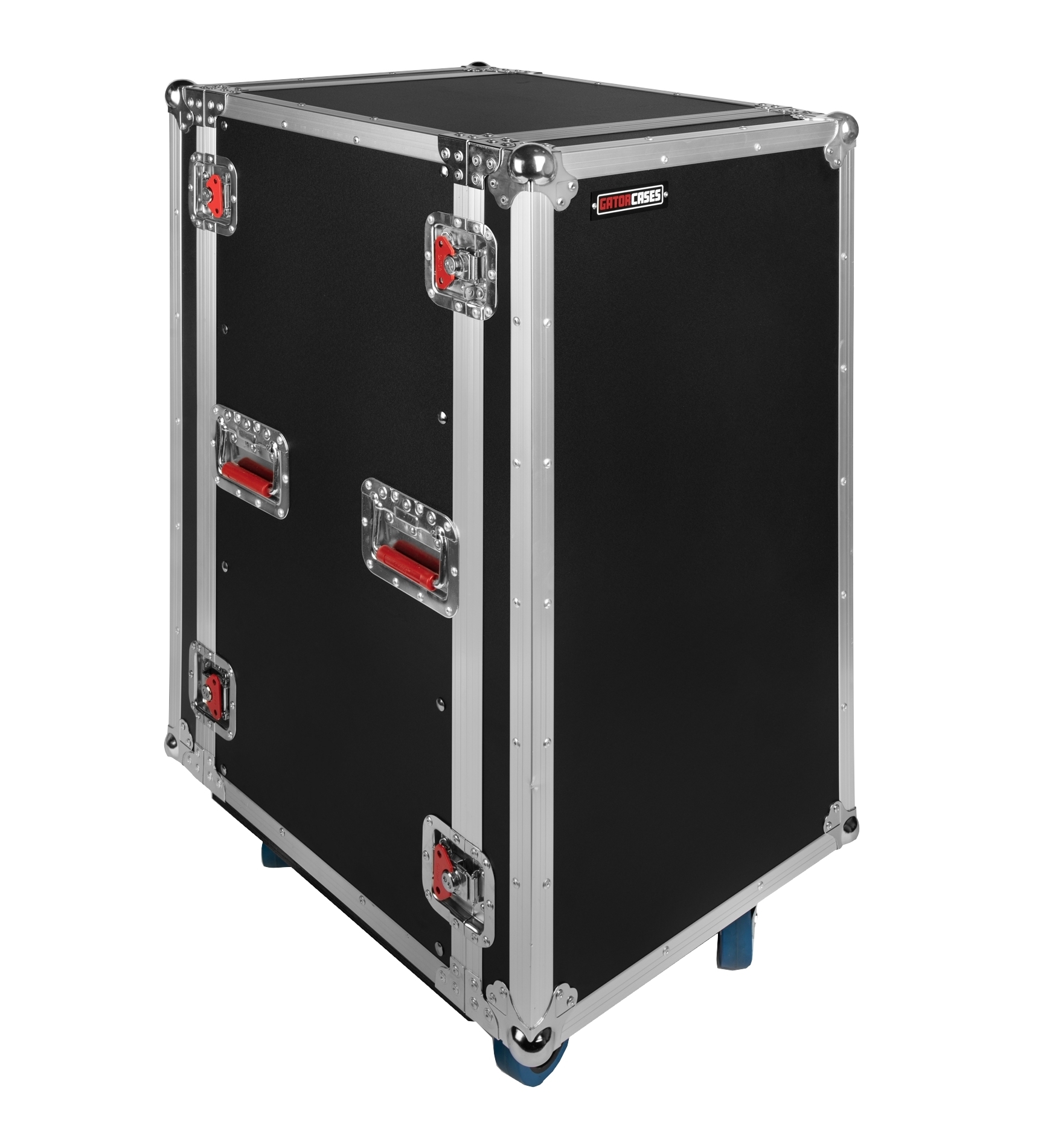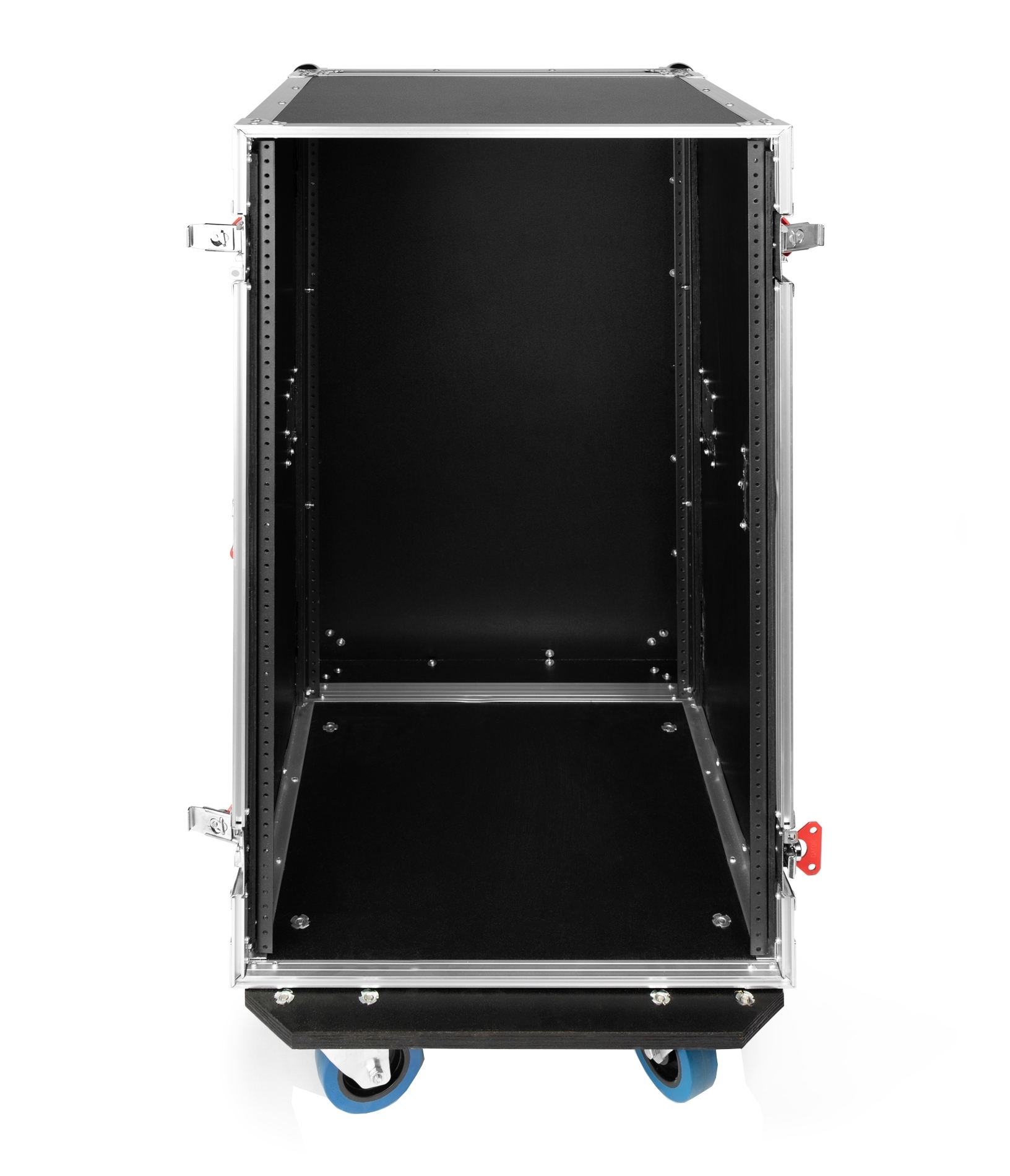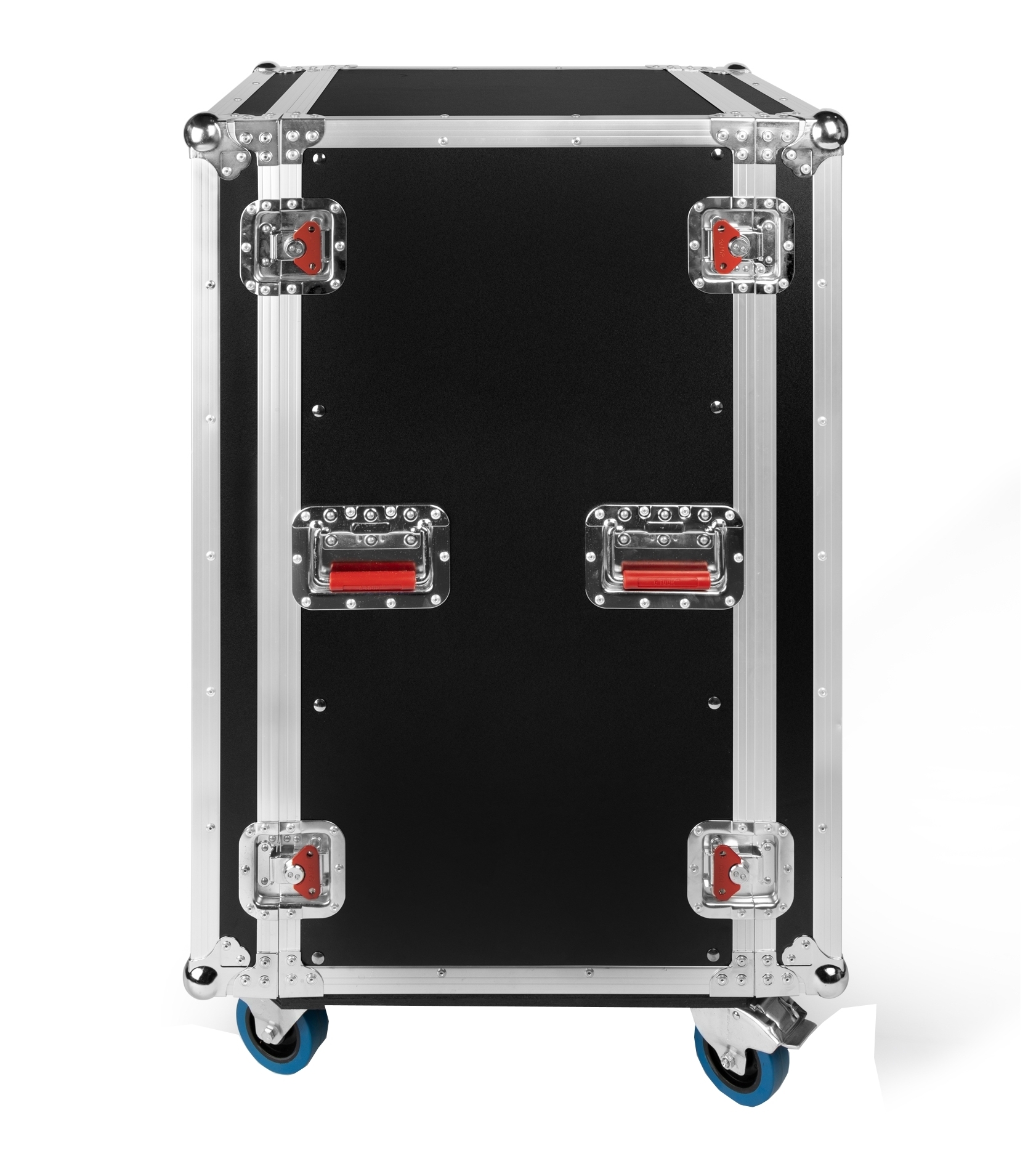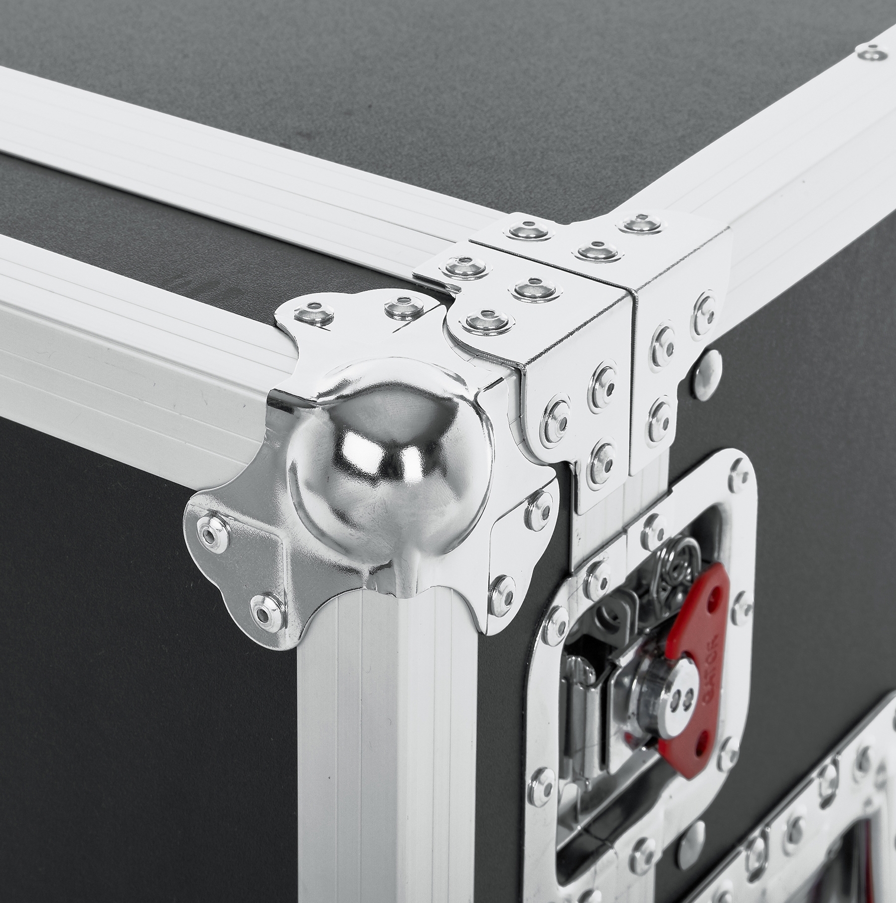 Флайт-кейсовые эксцентрик-замки и пружинная ручка для переноски с красной отделкой.