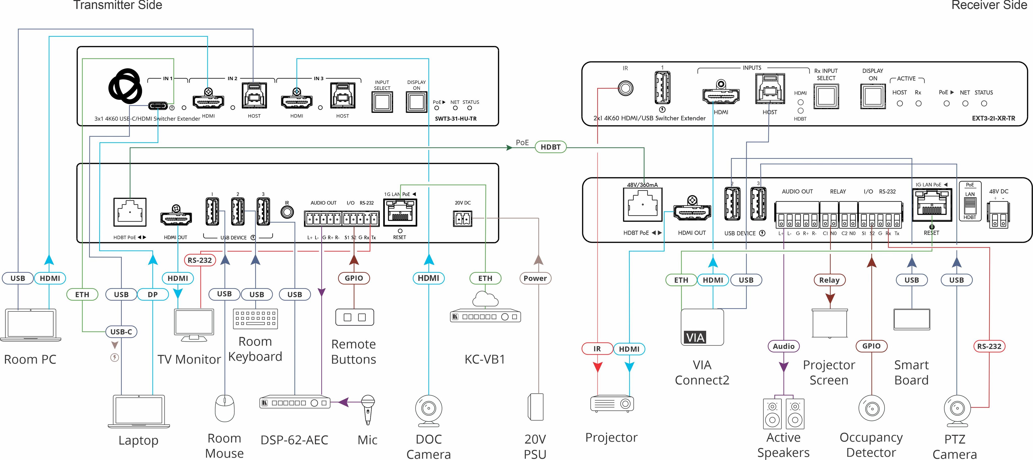 SWT3-31-HU-TR — это автоматический 3х1 коммутатор с USB-C входом, двумя комбинированными HDMI/USB-B входами, HDMI выходом и портом HDBaseT 3.0 с поддержкой PoE. Порт HDBaseT обеспечивает передачу или приём по экранированной витой паре (Cat6 или выше) видео 4K60 Гц (4:4:4), USB 2.0, Ethernet, RS-232 и ИК сигналов.