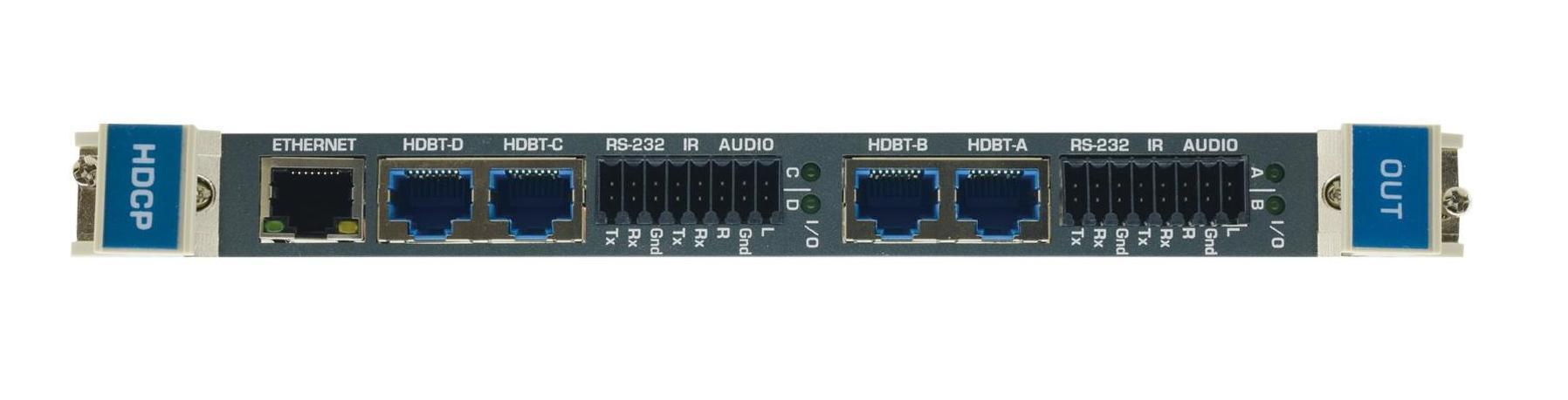 DTAxr-OUT4-F32 – четырехканальный выходной модуль HDMI (по линии HDBaseT) c поддержкой разрешений до 4K@60 Гц, 4:2:0 и эмбедированием или деэмбедированием аудио (при необходимости), предназначенный для использования в составе шасси мультиформатного модульного матричного коммутатора серии VS-3232. Модуль осуществляет вывод четырех сигналов HDBaseT с эмбедированным аудио, а также двунаправленных сигналов RS-232 и ИК, передаваемых по линии HDBaseT, из модульного шасси и передачу их по линии HDBaseT.