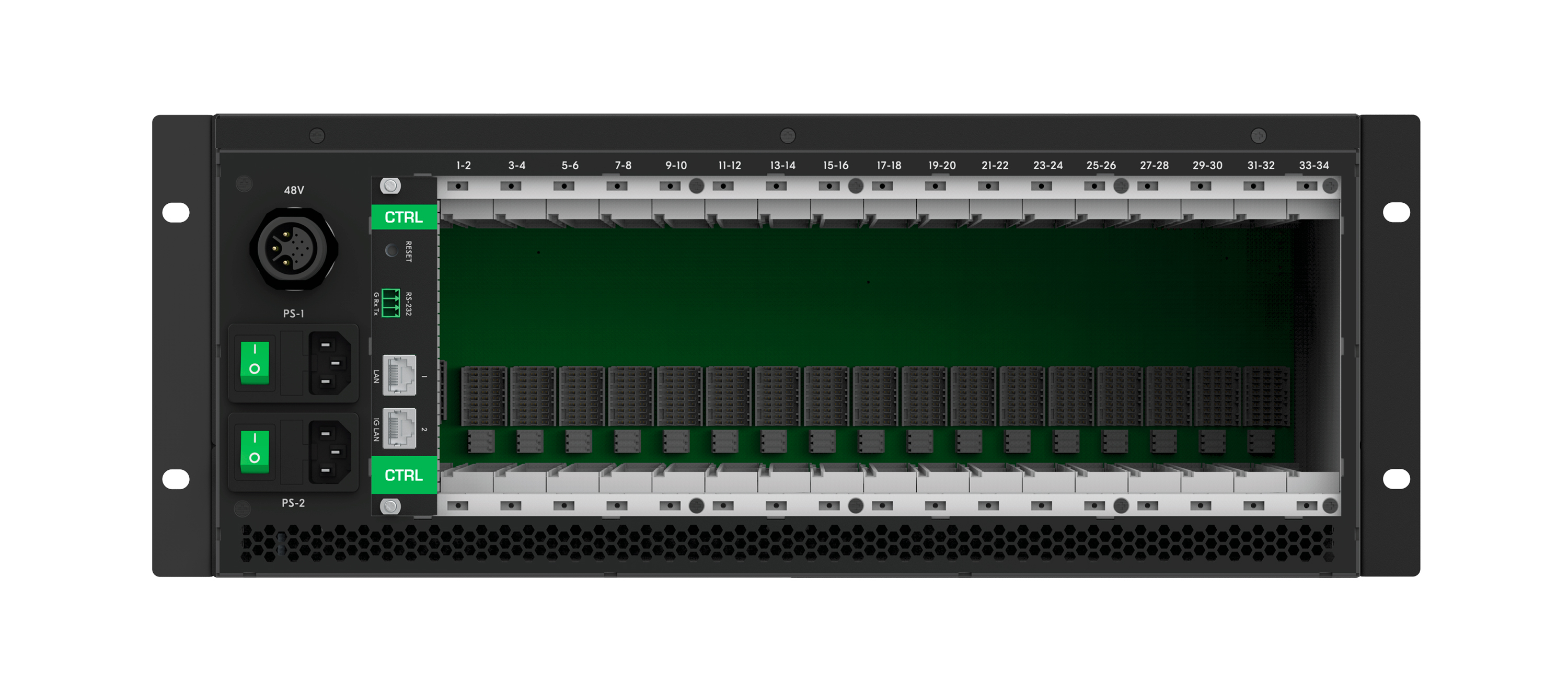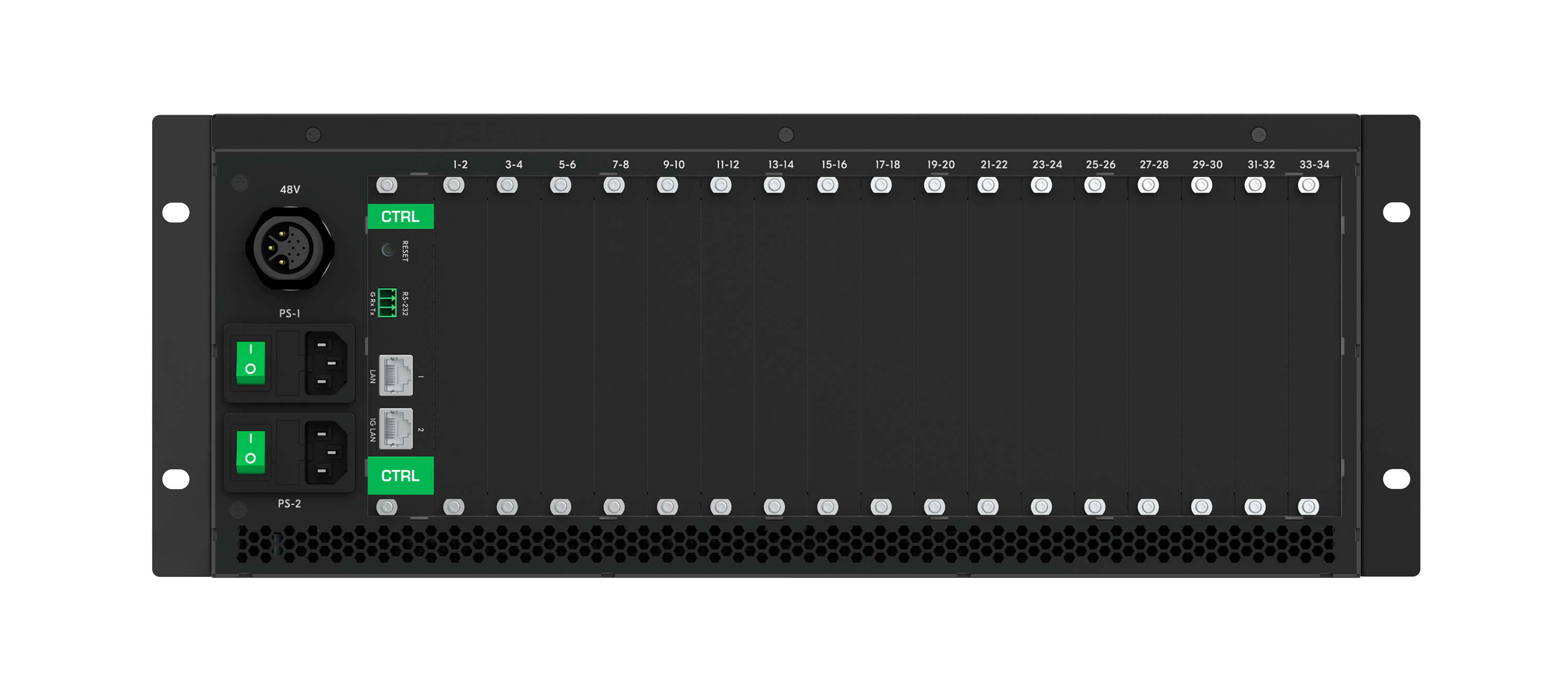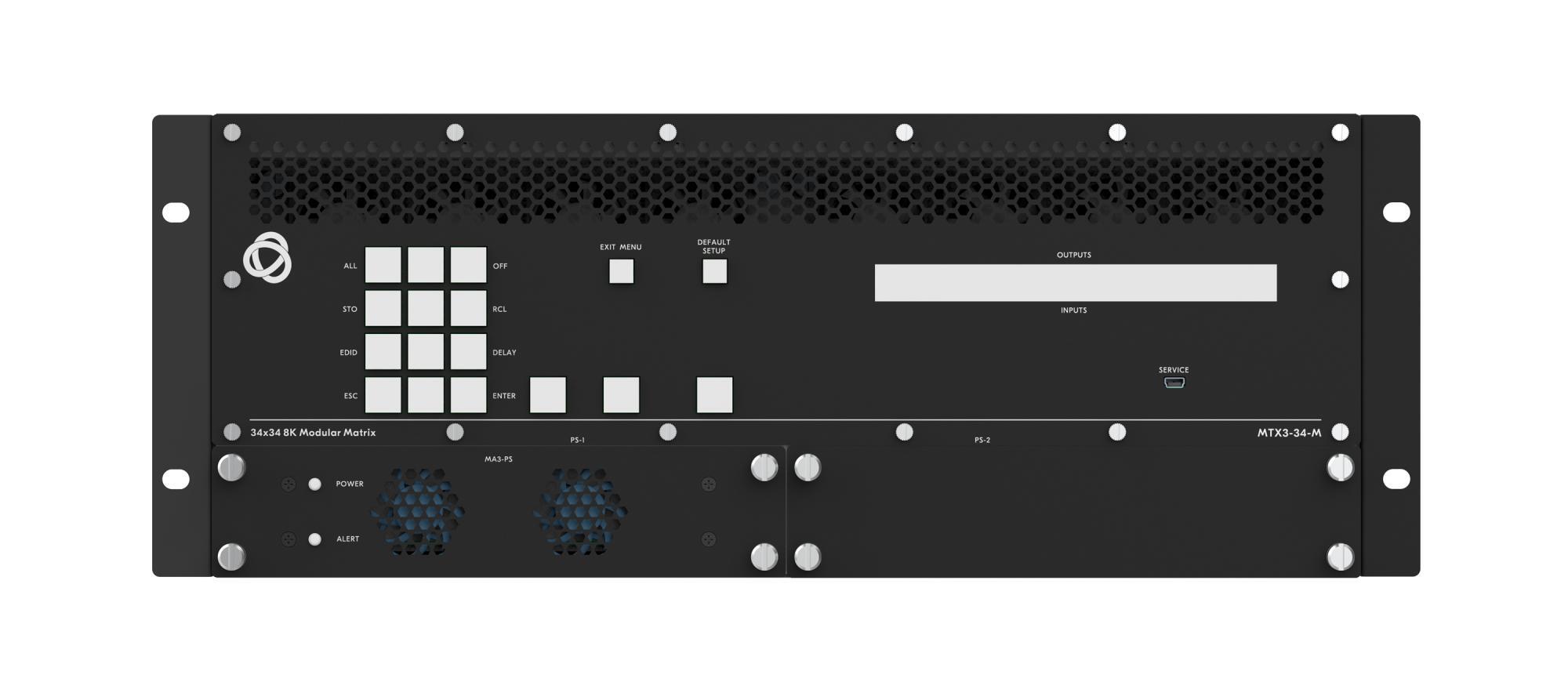 MTX3-34-M — модульный матричный коммутатор для работы с сигналами HDMI™, HDBaseT, VGA, SDI, а также аналоговыми аудиосигналами. Каждый из 17 слотов шасси допускает установку как входного, так и выходного модуля. Обеспечивается гибкий выбор соотношения числа входных/выходных модулей, благодаря чему можно создать матрицу размерностью от 2х32 до 32х2, а также любой другой конфигурации в вышеуказанных пределах с шагом в 2 выхода или 2 входа. Предусмотрена горячая замена модулей (без выключения матричного коммутатора). В устройстве имеется модуль управления, занимающий отдельный центральный слот. Шасси в будущем сможет обеспечить работу и новых модулей с поддержкой разрешений до 8K. Прежнее название - VS-34FD.