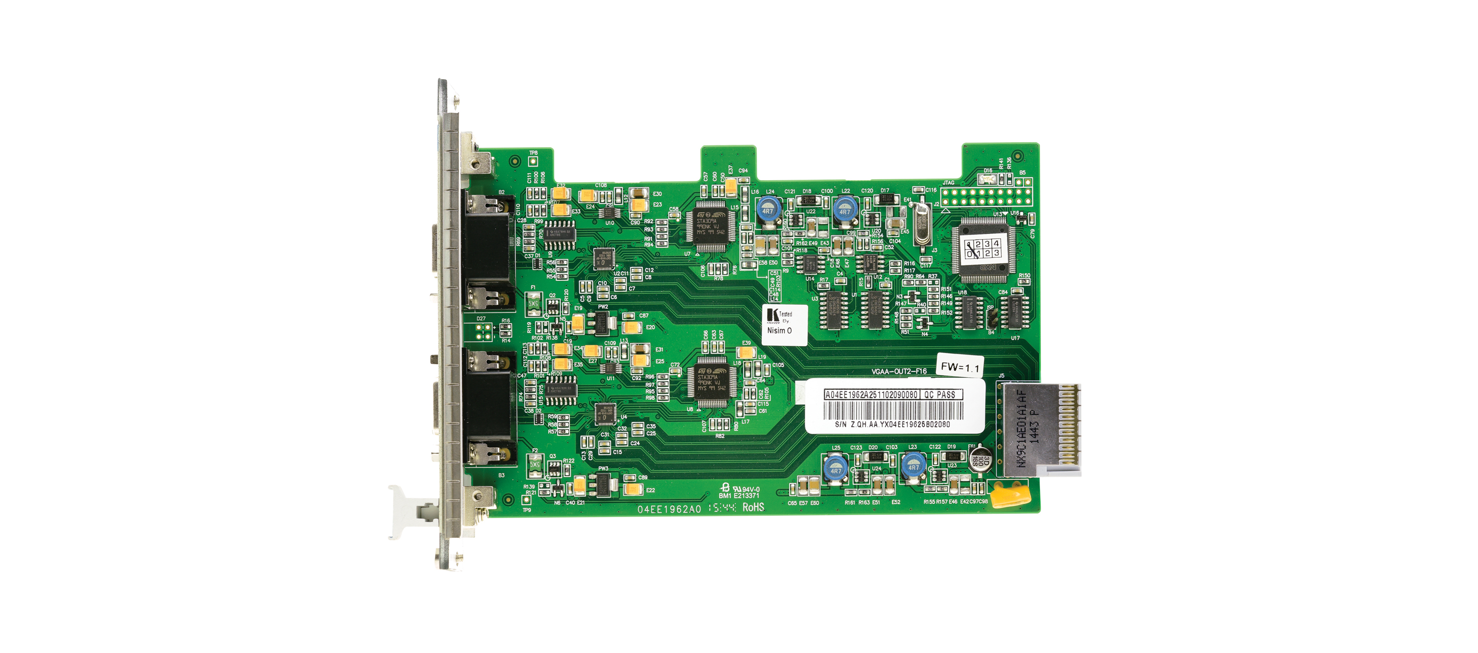 VGAA-OUT2-F16/F34 — двухканальный выходной модуль VGA и аналогового аудио, предназначенный для использования в составе шасси мультиформатных модульных матричных коммутаторов VS-1616 или VS-34FD. Модуль осуществляет вывод двух сигналов VGA, а также аналогового аудио из модульного шасси. Доступ к портам аудио осуществляется при помощи входящих в комплект переходных кабелей Kramer C-GF/GMAF-30.