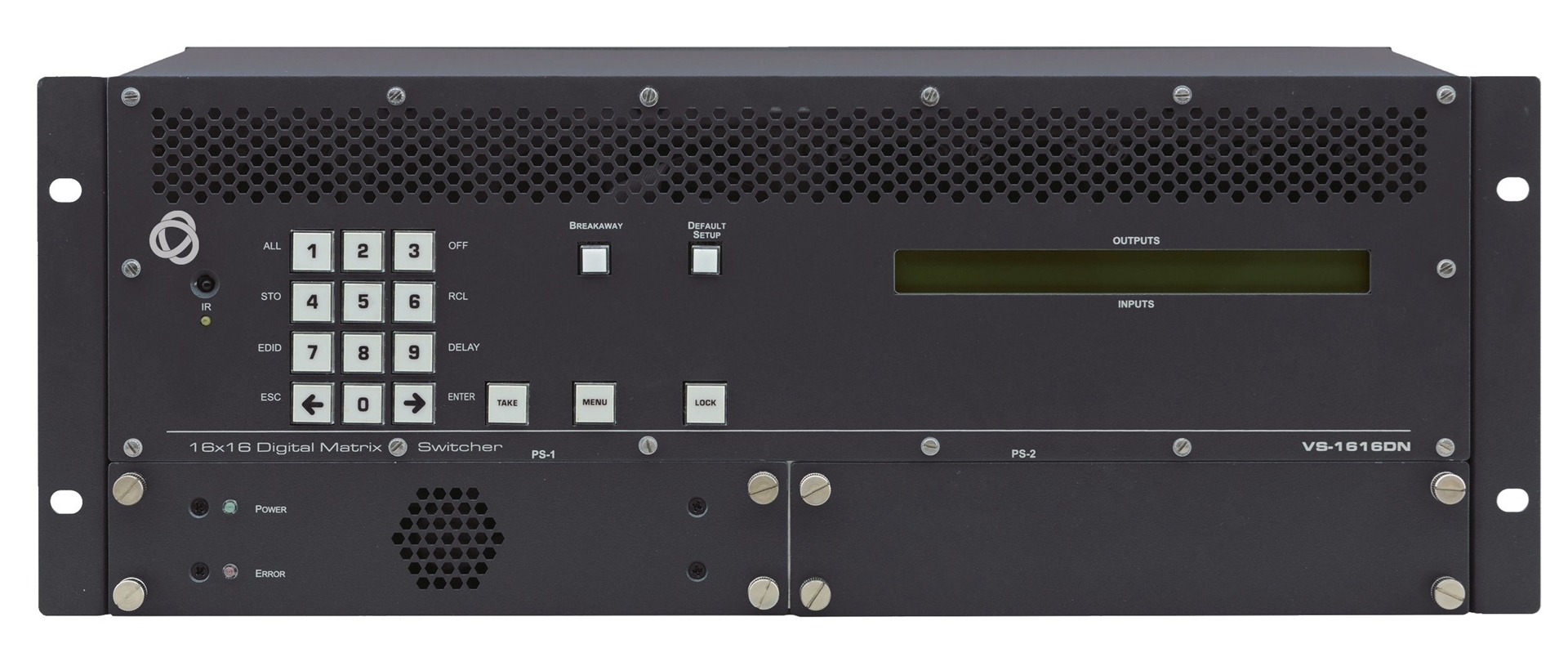 VS-1616DN-EM/STANDALONE – шасси мультиформатного матричного коммутатора с шестнадцатью слотами для установки интерфейсных модулей, позволяющее построить матричный коммутатор размерностью от 2x2 до 16x16 с шагом 2 входа/выхода. Поддерживаются разрешения сигналов до 4K60 (YUV 4:2:0). Поставляется с источником питания, встроенными модулями управления и тестирования.