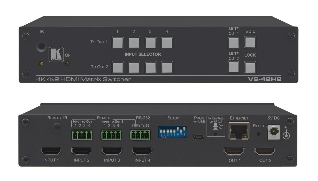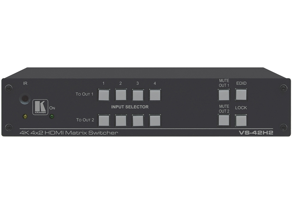 VS-42H2 — матричный коммутатор 4х2 HDMI c автоматическим или ручным переключением входов. Поддержка HDR и разрешений до 4K@60 Гц (4:4:4). Прибор осуществляет перетактирование входного сигнала, компенсацию АЧХ кабеля и переключение сигнала HDMI от любого из четырех источников, (в т.ч. поддерживающих HDCP-кодирование), на любой из двух выходов HDMI или на оба выхода одновременно. Выбор одного из двух режимов автоматического переключения: на вход с приоритетом или вход с последним по времени подключения источником сигнала. Возможность дистанционного ручного переключения входов.