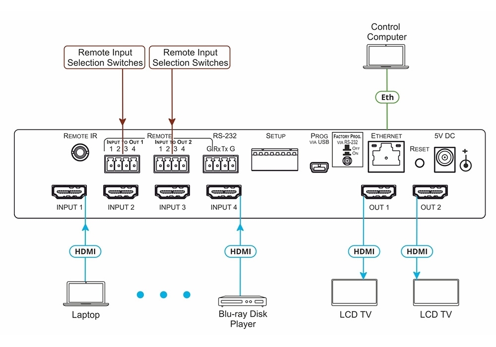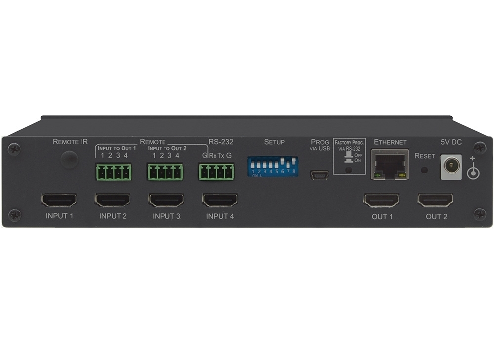 Разнообразие способов управления – выбор входа для каждого выхода, отключение сигнала на каждом выходе, считывание и сохранение блока данных EDID с помощью кнопок на лицевой панели. Удаленное управление по Ethernet с использованием встроенных веб-страниц, по протоколу Protocol-3000, по интерфейсу RS-232 или при помощи опционального ИК-пульта ДУ