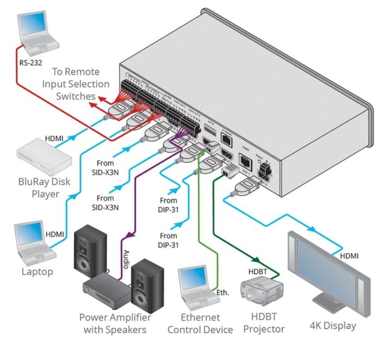 Возможность удаленного управления по интерфейсам RS-232 или Ethernet при помощи последовательных команд с использованием протокола Kramer Protocol 3000, а также с использованием встроенных веб-страниц