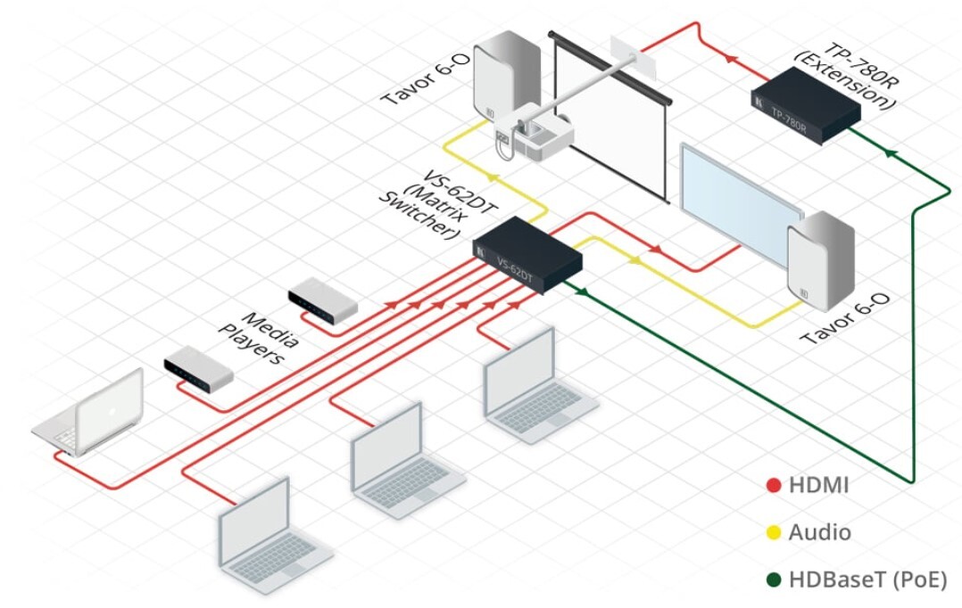 VS-62DT — матричный коммутатор 6х2 HDMI c автоматическим или ручным переключением входов и независимыми выходами HDMI и HDBaseT с поддержкой разрешений до 4K@60 Гц (4:2:0). Прибор осуществляет перетактирование входного сигнала, компенсацию АЧХ кабеля и переключение сигнала HDMI от любого из шести источников на любой из двух выходов: HDMI или HDBaseT, или на оба выхода одновременно. Выбор одного из двух режимов автоматического переключения: на вход с приоритетом или вход с последним по времени подключения источником сигнала. Возможность дистанционного ручного переключения входов. Режим удаленного выбора входа коммутатора по технологии Step-in, настраиваемый отдельно для каждого выхода. Прибор является источником питания PoE по линии HDBaseT для совместимых приемников, например, TP−580RXR.