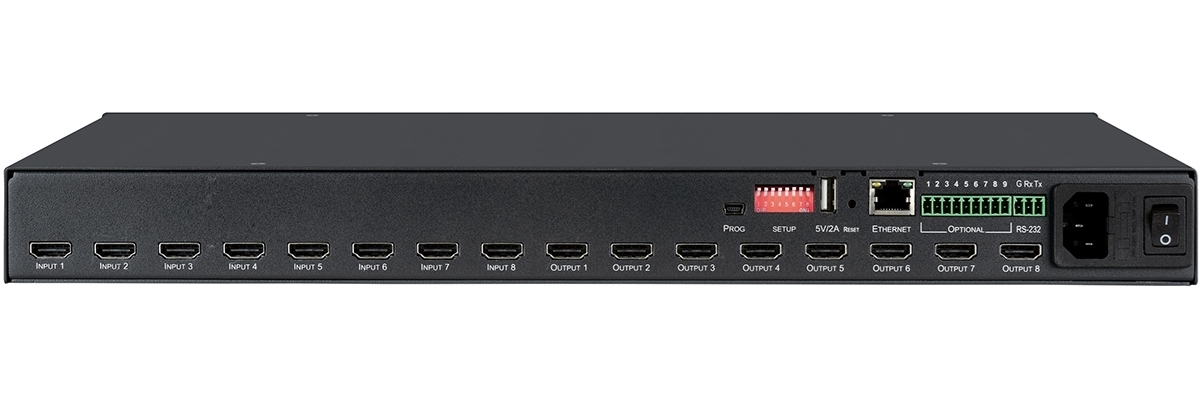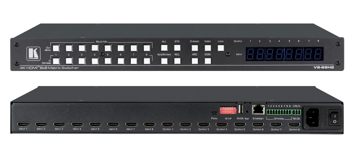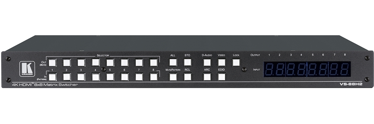 VS-88H2 — матричный коммутатор 8х8 сигналов HDMI c поддержкой разрешений до 4K@60 Гц (4:4:4 ) и технологии HDR. Прибор осуществляет перетактирование входного сигнала, компенсацию АЧХ кабеля и переключение сигнала HDMI от любого из восьми источников сигнала (в т.ч. поддерживающих HDCP-кодирование), на любой из восьми выходов HDMI или на любые комбинации выходов. VS-88H2 обладает непревзойденной гибкостью коммутации аудиосигналов, позволяя переключать любой эмбедированный цифровой аудиосигнал на любой цифровой выход в дополнение к восьми источникам обратного аудиоканала (ARC), что эквивалентно аудиоматрице размерностью 16x16.