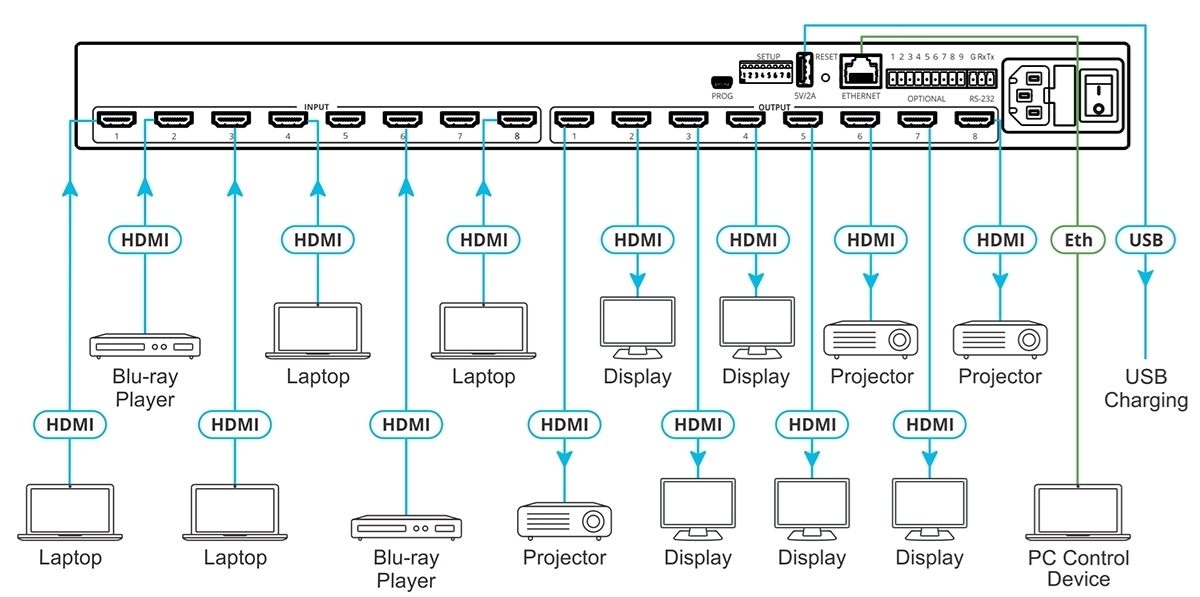 - Независимая коммутация аудио – любой эмбедированный цифровой аудиосигнал может переключаться на любой цифровой выход в дополнение к восьми источникам обратного аудиоканала (ARC), что эквивалентно аудиоматрице размерностью 16x16 (8 входов HDM с эмбедированным аудио + 8 обратных аудиоканалов ARC на входе + 8 выходов HDMI + 8 выходов ARC)