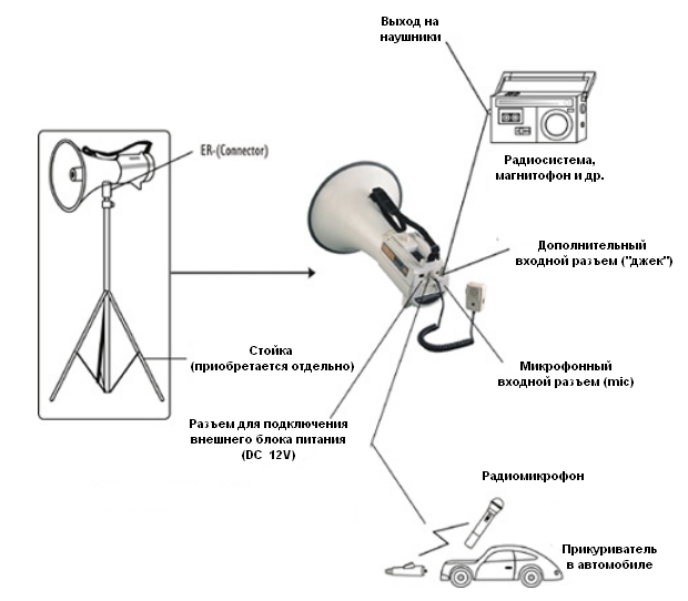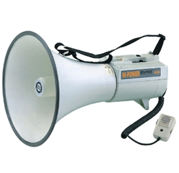 Рупорный громкоговоритель (мегафон) с выносным микрофоном и режимами 'сирена' и 'свисток'.