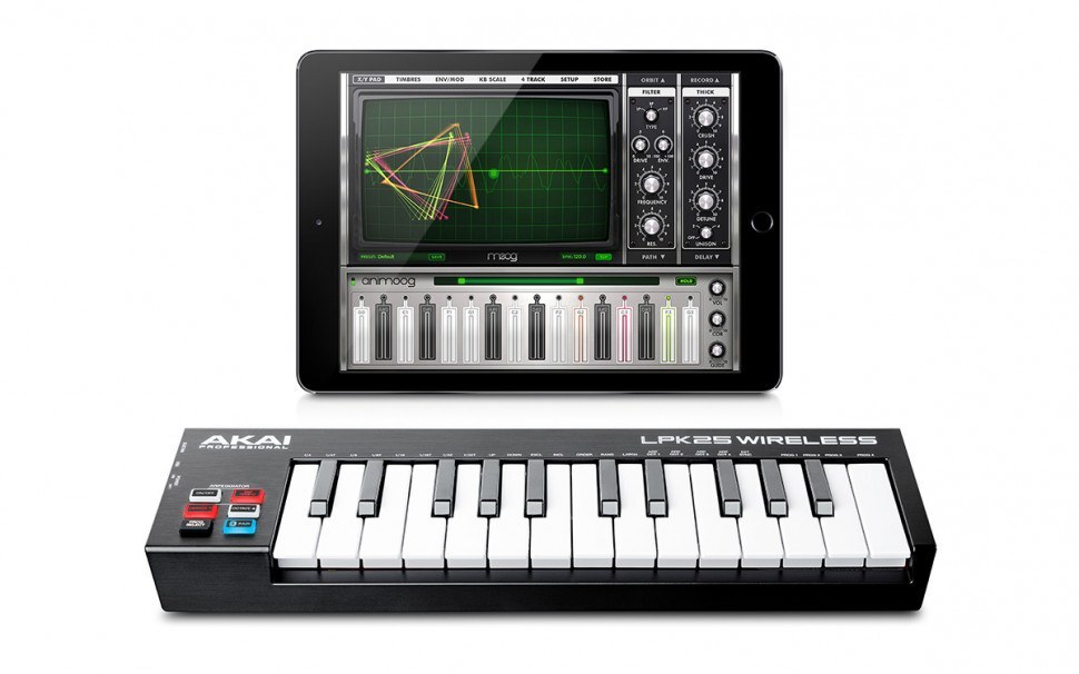 AKAI PRO LPK25 WIRELESS – гибкий и многофункциональный компактный USB/MIDI контроллер с возможностью беспроводного подключения. Это в полной мере портативная модель, имеющая небольшие габариты и вес всего 490 грамм, которую не только можно подключать к компьютеру через Bluetooth (в том числе для работы с MIDI) – она также может работать абсолютно независимо от внешних источников электропитания, от трёх батарей АА. Примерное время работы от батарей – не менее 12 часов непрерывной игры. Возможно также подключение и питание устройства через USB (кабель поставляется в комплекте). Эта модель идеально подойдёт для часто выступающих музыкантов. LPK25 WIRELESS – многофункциональные клавишные, обладающие широким спектром современных функций и возможностей. Модель оснащена 25-нотной клавиатурой с мини-клавишами, чувствительными к скорости нажатия. Имеется арпеджиатор, разъем для подключения педали сустейна, регуляторы для быстрого переключения на октаву вверх/вниз. Четыре программируемых банка памяти позволяют сохранять настройки.