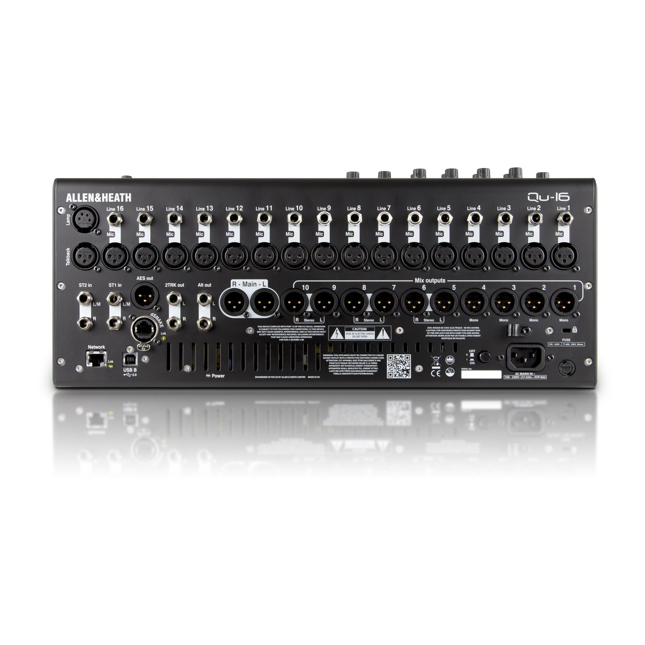 Этот микшер унаследовал многие особенности хорошо известных цифровых микшерных систем Allen & Heath GLD и iLive. Qu-16 позволяет сохранять и вызывать любые настройки (включая положение 17 моторизованных фейдеров и параметры цифровых предусилителей), имеет сенсорный дисплей с интуитивно понятным меню, встроенный мультитрек-рекордер Qu-Drive, дает возможность подключать по интерфейсу dSNAKE модули расширения со входами/выходами и системы персонального мониторинга, выполнять потоковую передачу многоканального аудио по USB на компьютеры Mac и осуществлять управление с iPad при помощи приложения Qu-Pad, а также оснащен встроенными процессорами эффектов с большой библиотекой пресетов – такими же, как в системе iLive.