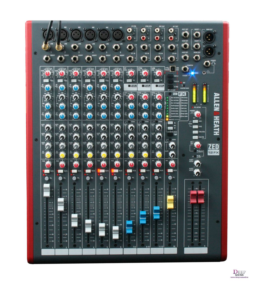 Микшеры ALLEN&HEATH ZED12FX имеют несколько моноканалов, три двойных стереоканала, встроенный процессор эффектов, USB-интерфейс для обмена двухканальными аудиосигналами с компьютером (поддерживаются стандартные драйверы Windows и MacOS X, частоты дискретизации 32, 44,1 и 48 кГц, разрядность 16 бит).
