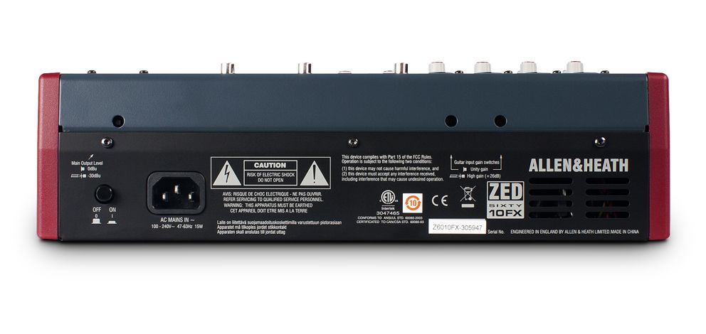 ZED60-10FX имеет четыре моно входа, два из которых оснащены высокоомными разъемами Jack, к которым можно напрямую без DI бокса подключать электрогитары. Также предусмотрены два стерео входа для MP3/CD проигрывателей и электронных клавишных. Как и все микшерные пульты серии ZED, новинка оснащена интерфейсом USB, с помощью которого можно реализовать запись стерео. Кроме этого, ZED60-10FX имеет мониторную секцию с выходами для наушников и акустических систем и 16 встроенных процессоров эффектов, созданных на базе процессоров эффектов цифровой микшерной системы Allen & Heath iLive.