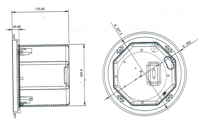 Габариты - диаметр 252мм, глубина 171мм (установочный диаметр 220мм)