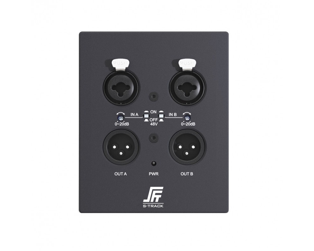 S-Track Dpanel обеспечивает сигнальное соединение между аналоговым входом и выходом и каналом Dante, для чего требуется сетевой источник питания PoE. Панель поддерживает два набора симметричных аналоговых сигналов ввода-вывода для подключения к системе Dante через локальную сеть. Входной интерфейс использует XLR два в одном для включения фантомного питания и функции регулировки усиления входного сигнала. Выходной интерфейс - стандартный 3-контактный XLR, выходной балансный аналоговый сигнал.