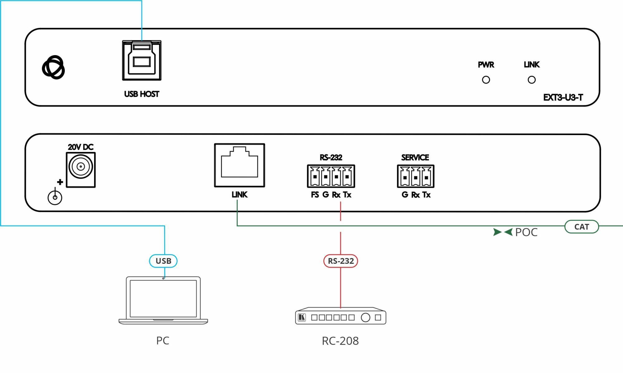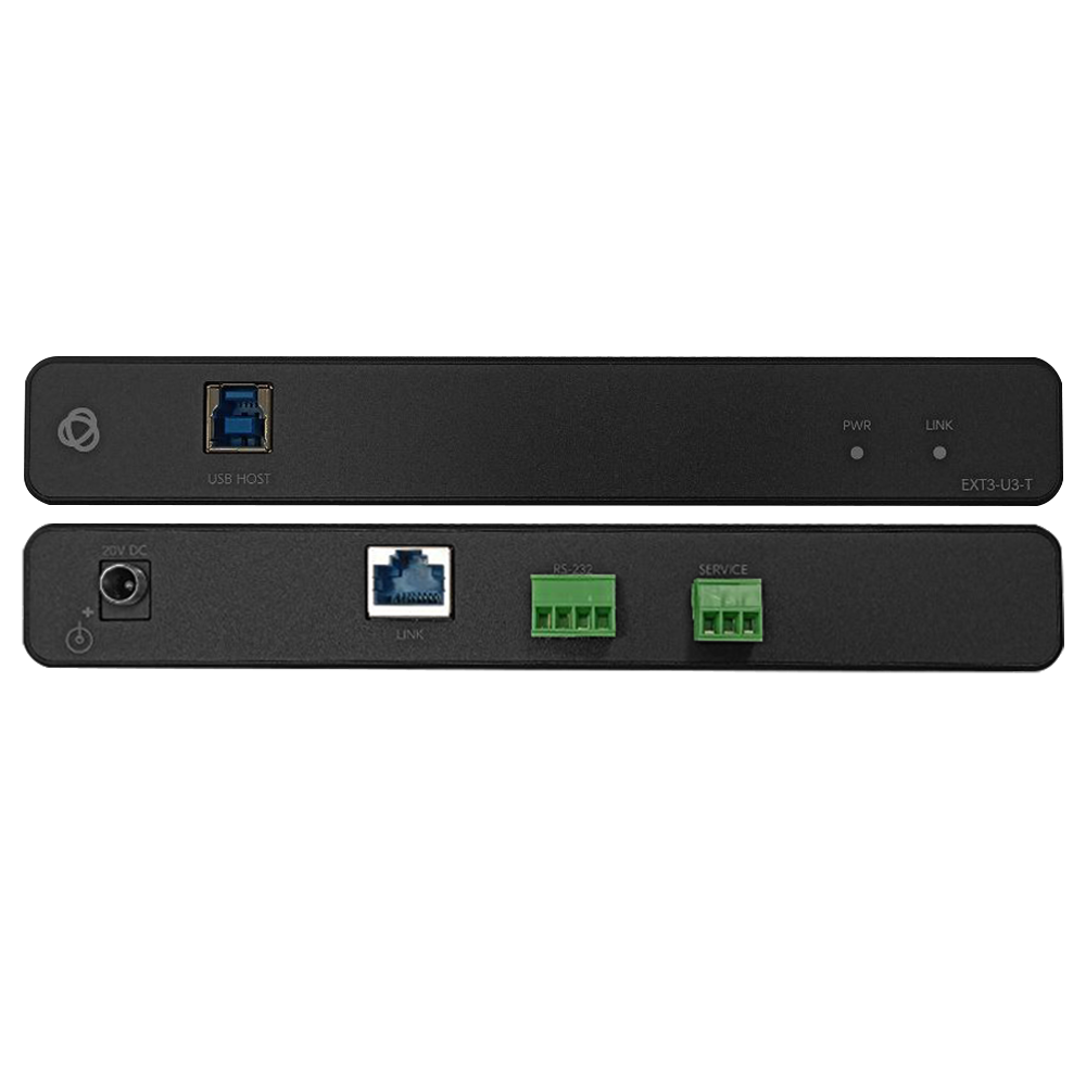 EXT3-U3-T — передатчик USB 3.2 Gen1 по кабелю витой пары с поддержкой двустороннего питания PoC. Прибор преобразует сигналы USB 3.2 Gen1 от подключенного хоста, а также сигналы управления RS-232, в основанный на формате HDBaseT сигнал CATx, который передается по кабелю медной витой пары на совместимый приемник (например EXT3−U3−R ), осуществляющий обратное преобразование CATx в исходные сигналы.