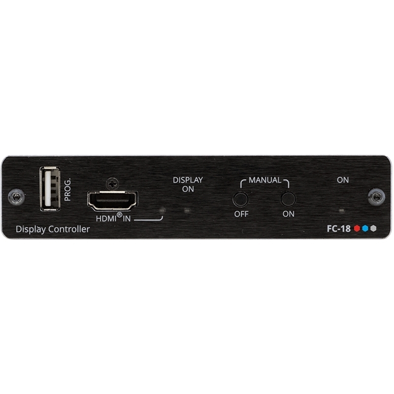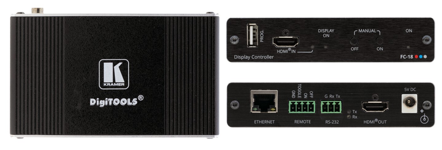 FC-18 — контроллер включения/выключения дисплея с поддержкой сигналов HDMI, технологии HDR и разрешений до 4K@60 Гц (4:4:4). Прибор осуществляет перетактирование входного сигнала, компенсацию АЧХ кабеля и пропуск сигнала HDMI со входа на выход. При обнаружении сигнала на входе прибор посылает команду на включение проектора или дисплея, при пропадании сигнала на входе прибор посылает команду на выключение устройства отображения. FC-18 может также использоваться для управления устройством отображения в ручном режиме с помощью кнопок на лицевой панели, а также дистанционно — по Ethernet или путем дистанционного замыкания контактов. FC-18 — контроллер включения/выключения дисплея с поддержкой сигналов HDMI, технологии HDR и разрешений до 4K@60 Гц (4:4:4). Прибор осуществляет перетактирование входного сигнала, компенсацию АЧХ кабеля и пропуск сигнала HDMI со входа на выход. При обнаружении сигнала на входе прибор посылает команду на включение проектора или дисплея, при пропадании сигнала на входе прибор посылает команду на выключение устройства отображения. FC-18 может также использоваться для управления устройством отображения в ручном режиме с помощью кнопок на лицевой панели, а также дистанционно — по Ethernet или путем дистанционного замыкания контактов.