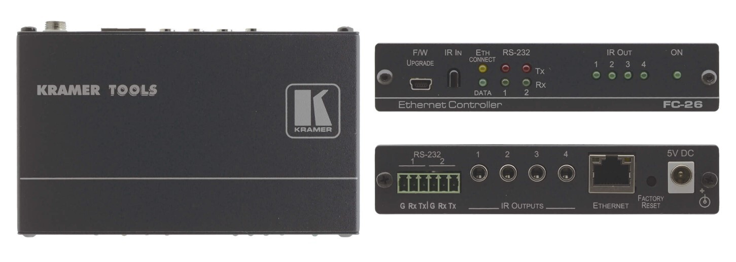 FC-26 — преобразователь интерфейса, работающий в сети Ethernet и имеющий 6 портов управления: 2 RS-232 и 4 ИК. При помощи данного устройства пользователь по своей локальной сети может удаленно управлять различным аудио-видео оборудованием, таким как масштабаторы, видеопанели, усилители мощности, медиаплееры, и т.д., используя вышеуказанный набор интерфейсов. Устройство может использоваться в качестве шлюза-расширителя портов в системе Kramer Control.