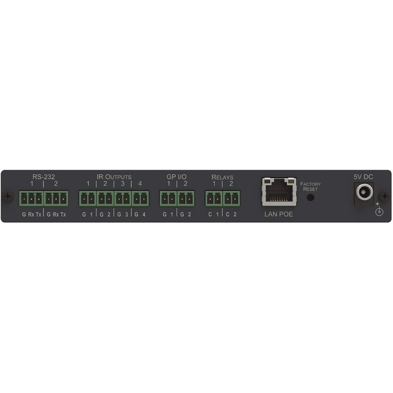 Интерфейсы управления: 2 порта RS-232 для управления оборудованием при помощи последовательных команд; 4 ИК-порта для подключения ИК-излучателей для управления мультимедийным оборудованием+ 1 ИК-порт для обучения командам от ИК-пульта ДУ; 2 порта ввода-вывода общего назначения GPI/O, которые могут быть сконфигурированы в качестве цифрового входа, цифрового выхода или аналогового входа для управления датчиками движения, запирающими устройствами дверей, уровнем громкости в аудиоусилителях, а также уровнем освещения; 2 реле с «сухими контактами» для управления моторизованными шторами и экраном, системой освещения, а также иными системами и оборудованием в управляемом пространстве