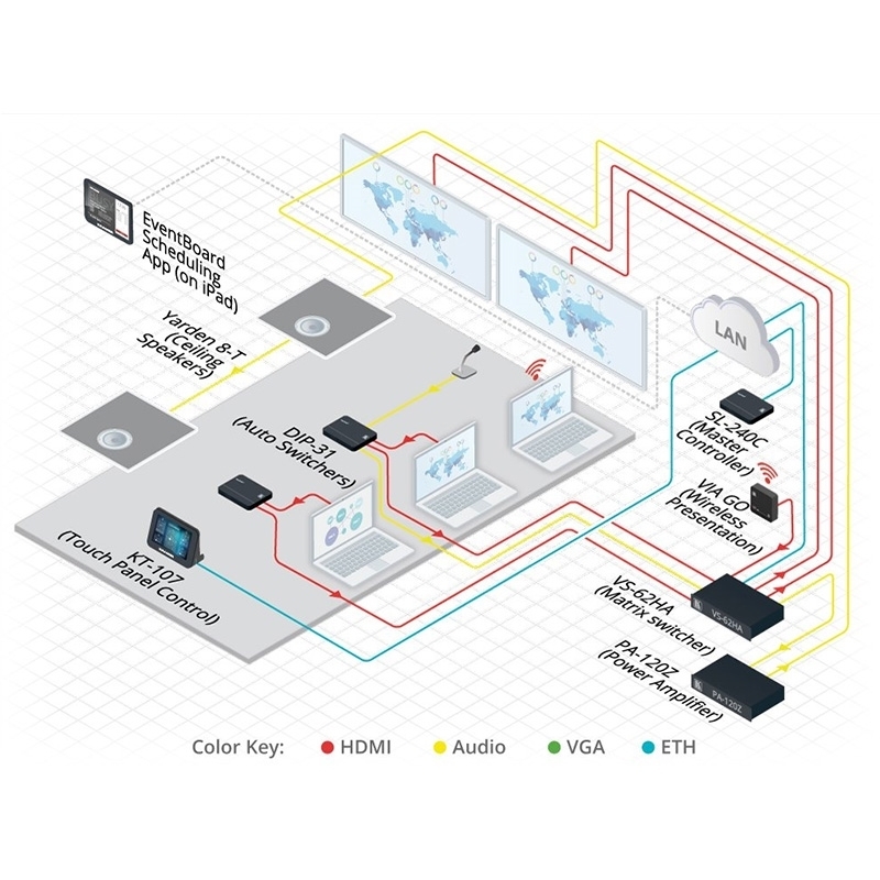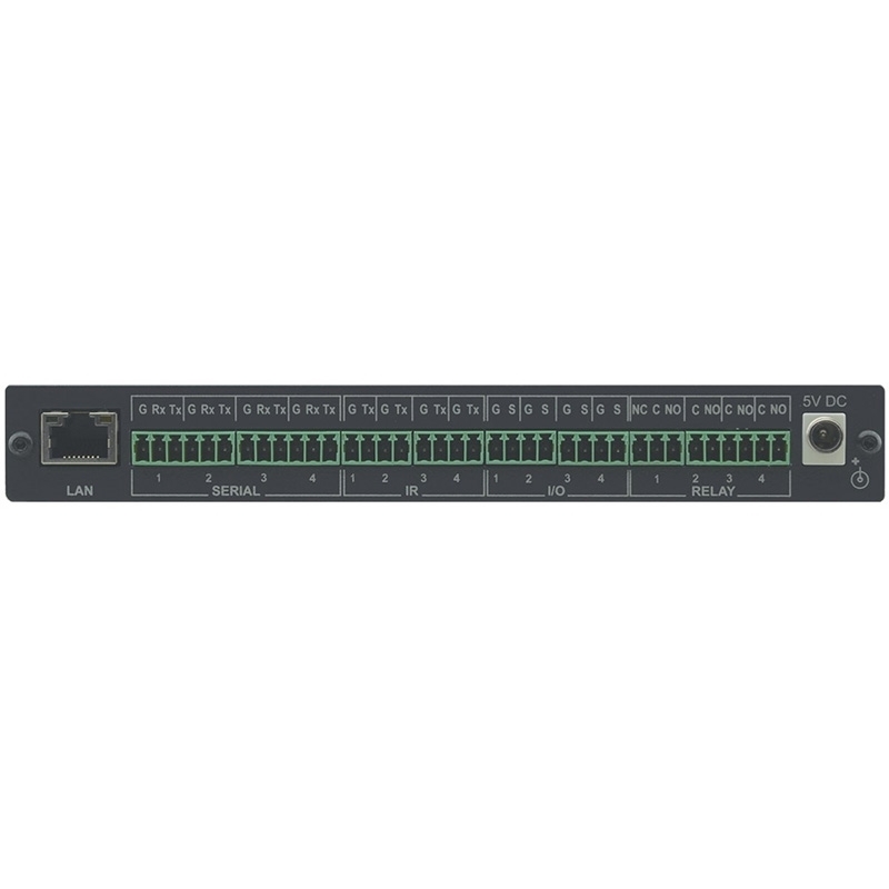 - Интерфейсы управления: 4 порта RS-232 для управления оборудованием при помощи последовательных команд 4 ИК-порта для подключения ИК-излучателей для управления мультимедийным оборудованием + 1 ИК-порт для обучения командам от ИК-пульта ДУ 4 порта ввода-вывода общего назначения GPI/O, которые могут быть сконфигурированы в качестве цифрового входа, цифрового выхода или аналогового входа для управления датчиками движения, запирающими устройствами дверей, уровнем громкости в аудиоусилителях, а также уровнем освещения 4 реле с «сухими контактами» для управления моторизованными шторами и экраном, системой освещения, а также иными системами и оборудованием в управляемом пространстве