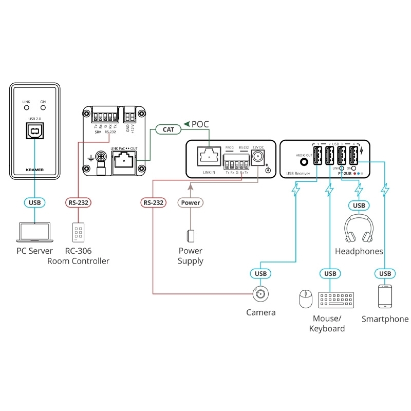 - Удлинение интерфейса USB для широкого класса периферийных устройств, включающего камеры, сенсорные панели, интерактивные доски, накопители на жестких дисках, игровые контроллеры, аудиоустройства, принтеры, сканнеры, а также устройства HID (Human Interface Devices), такие как мышь и клавиатура. Устройства двойного назначения, и устройства типа OTG (On The Go), такие как смартфоны и планшеты, подключенные или со стороны передатчика (USB-хост), или со стороны приемника (удаленные USB-порты), могут обмениваться данными периферийным устройством или хостом соответственно