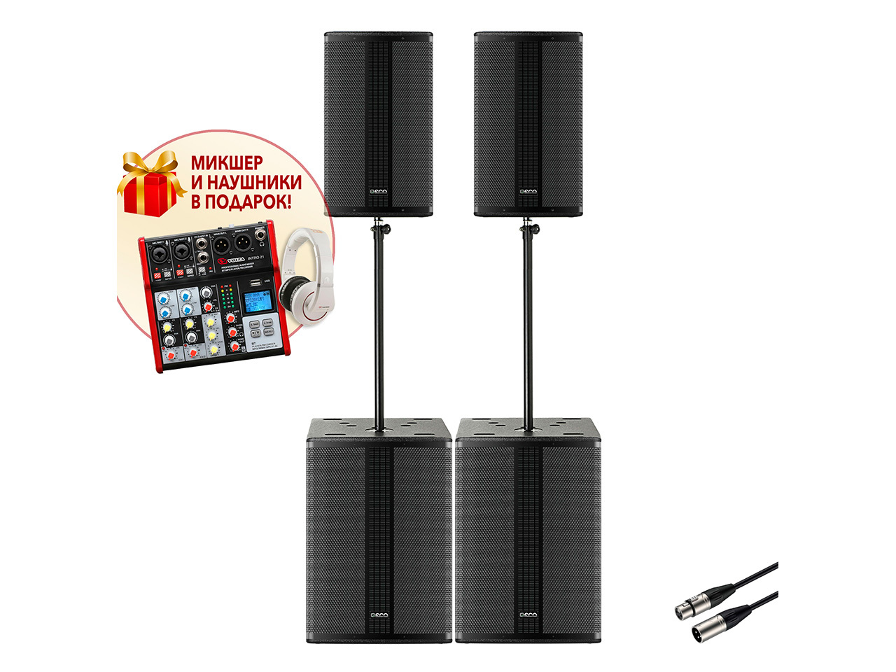2 активные широкополосные системы TANGO-12A, 2 активный сабвуфера TANGO SUB-15A, 2 установочных стойки SSA010 BLACK ROXTONE, кабели для соединения акустических систем SMXX200/2 - 2 шт, Каждый покупатель комплекта TANGO SHOW SET получает в подарок микшерный пульт INTRO 21 и замечательные стильные наушники VOLTA REVOLUTION