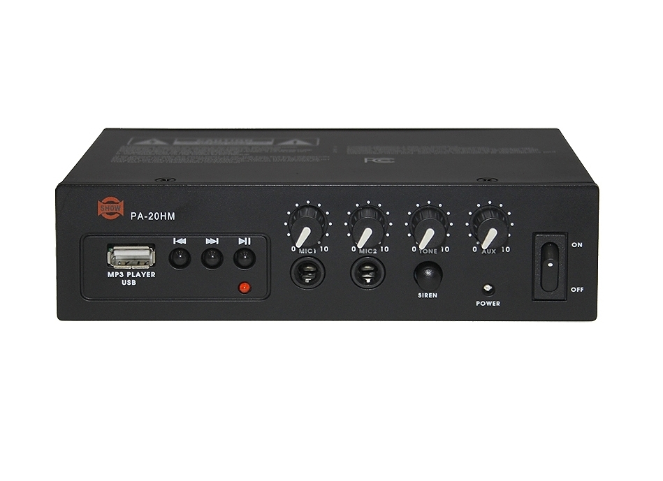 PA-20HM - очень компактные усилители, специально разработанные для стационарных или мобильных инсталляций. Их небольшой размер и легкий вес позволяют легко разместить их в небольшом пространстве. PA-20HM является идеальным решением для зонирования информационных пунктов, билетных касс и транспортных средств, использующих акустическую систему на крыше. Усилитель оснащен MP3-плеером с портом USB, а также сиреной, запускаемой нажатием кнопки на передней панели. Доступны 2 микрофонных входа с разъемами TRS 6,35 мм, плюс 1 стереовход Aux на задней панели с разъемами RCA. Все регуляторы громкости находятся на передней панели и имеют простую настройку эквалайзера. В выходной секции используются разъемы евроблок с нагрузкой 4 Ом, 70/100 В.