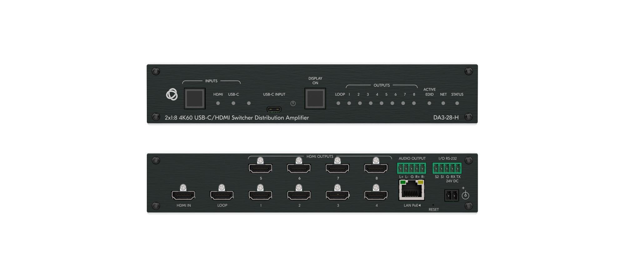DA3-28-H — комбинированный прибор, сочетающий функции коммутатора 2х1 и усилителя-распределителя 1:8 для видеосигналов 4K HDR с поддержкой стандарта защиты контента HDCP 2.2. При помощи устройства осуществляется выбор входа HDMI или USB-C, эквализация и перетактирование входного сигнала и распределение его на 8 идентичных выходов HDMI.