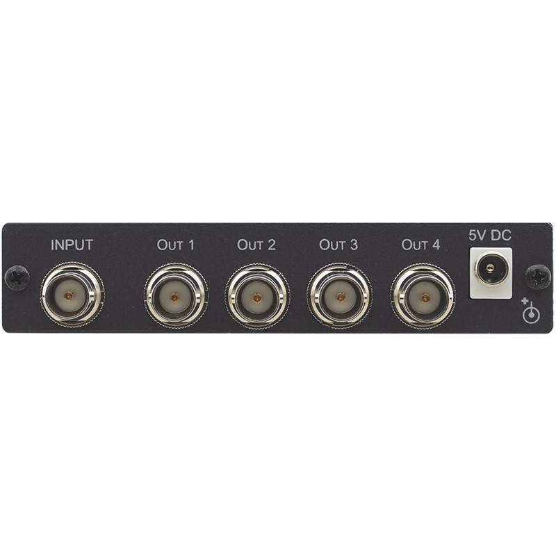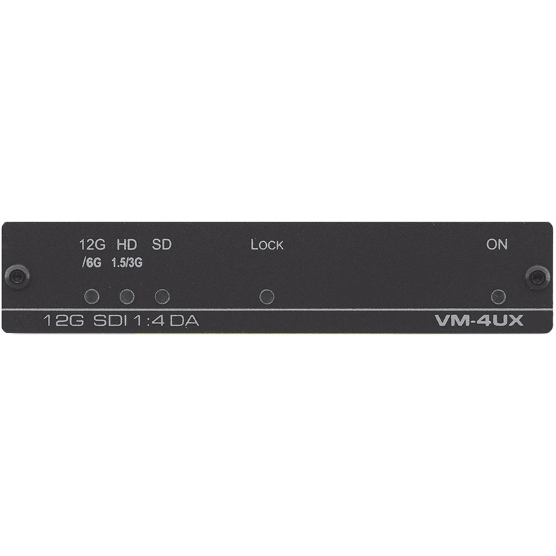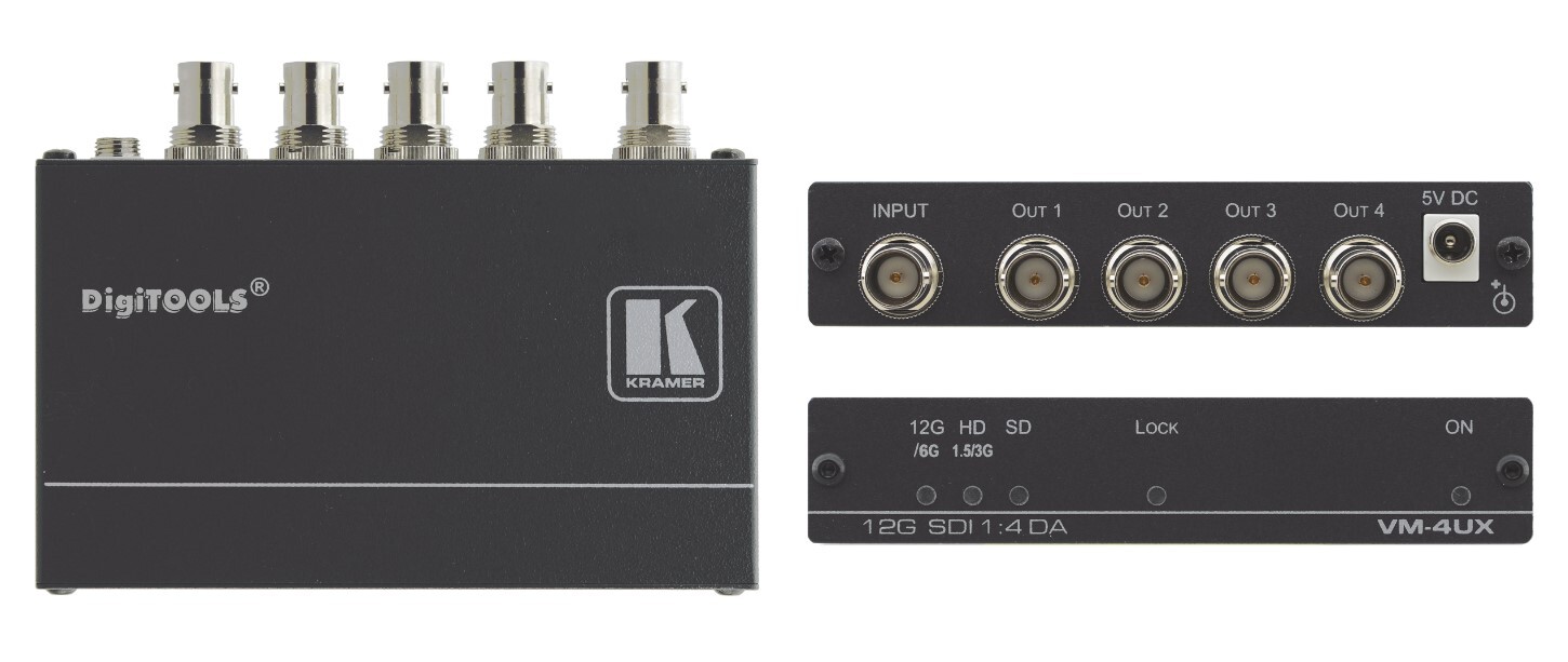 VM-4UX — усилитель-распределитель 1:4 сигналов HD-SDI с разрешением до 4K@60 Гц (4:2:2) и скоростью передачи до 12 Гбит/с . Прибор автоматически определяет скорость передачи данных входного сигнала SDI, выполняет перетактирование и компенсацию АЧХ кабеля, после чего распределяет сигнал на четыре идентичных выхода.
