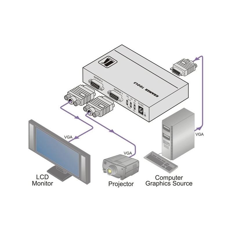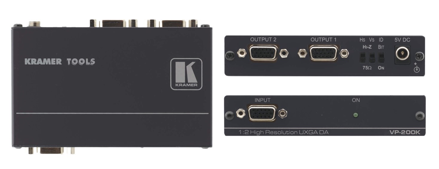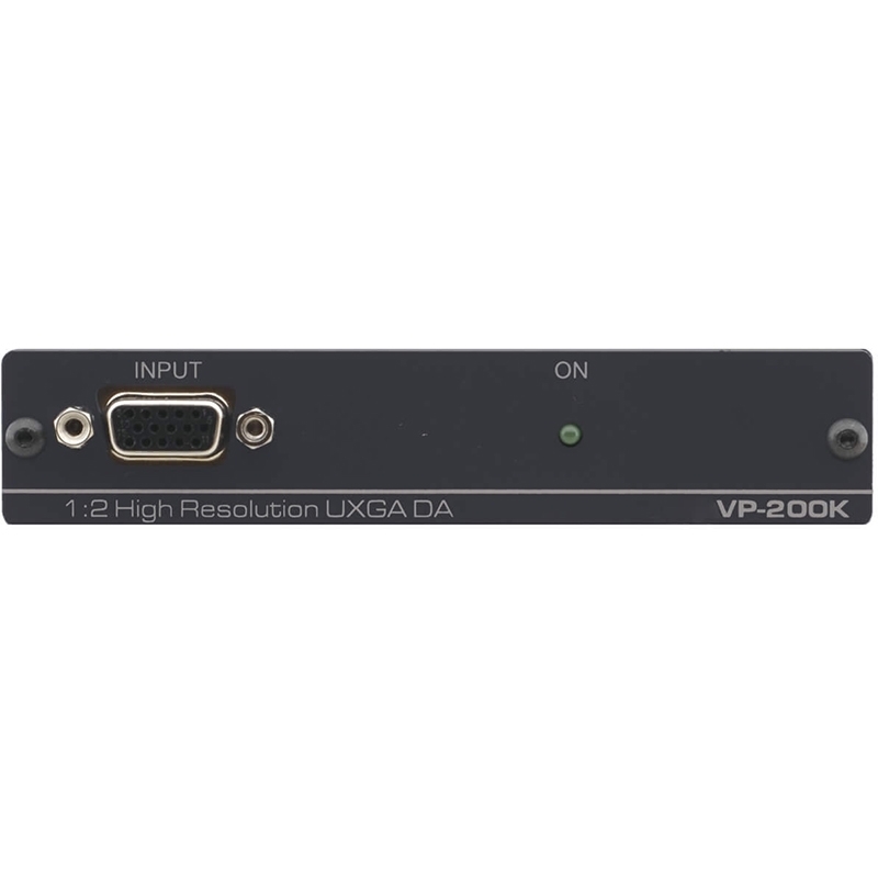 VP-200K — усилитель-распределитель 1:2 сигналов компьютерной графики с разрешением до UXGA. Прибор осуществляет усиление и распределение входного сигнала на два идентичных выхода. Имеются переключатели входного сопротивления для двух видов источника сигнала, а также выключатель функции опознавания идентификационного бита. Имеется отключаемая система обработки входного сигнала синхронизации Kr–isp®, восстанавливающая синхросигнал даже в случае его очень низкого уровня, благодаря чему обеспечивается совместимость с широким рядом компьютеров.